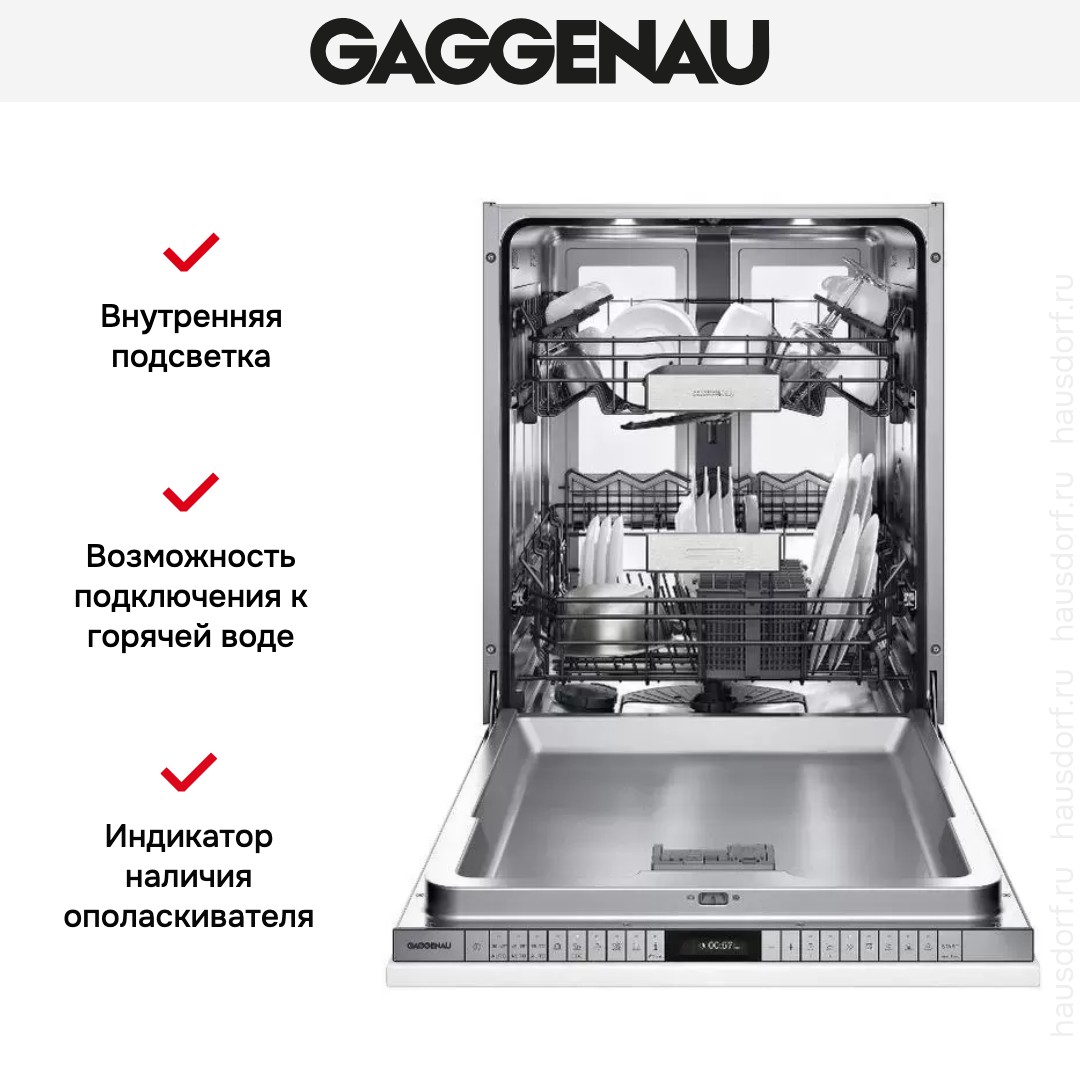 Модель Гаггенау имеет стандартные размеры — высоту 81,5 см, ширину 59,8 см, глубину 55 см. Для различных типов загрязнений и видов посуды предназначены 8 автоматических программ и 6 дополнительных опций, включая ускоренную мойку, интенсивную сушку, половинную загрузку и другие. — Сенсорное управление с TFT-дисплеем позволяет выбрать программу, отображает время до ее окончания, наличие соли, ополаскивателя, подачу воды. Имеется информационная клавиша для выдачи сведений о выбранной программе и настройкам. Таймер отсрочки старта поможет спланировать запуск на следующие сутки.