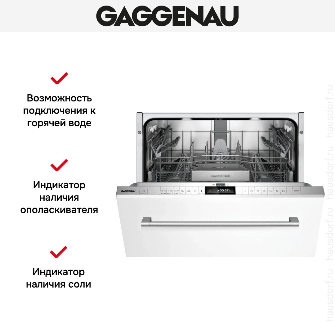 Встраиваемая полноразмерная посудомоечная машина Gaggenau с вместимостью до 13 комплектов посуды.