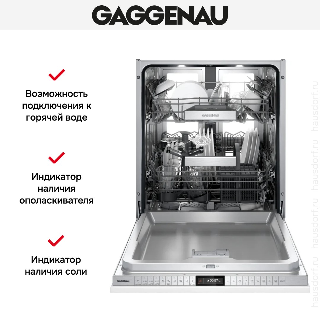 Встраиваемая посудомоечная машина Gaggenau DF480101F представляет собой полностью интегрируемую модель, которая аккуратно исчезает за фасадом кухонного гарнитура и сохраняет единый интерьер. Ее утонченная лицевая панель из нержавеющей стали сочетается с любым стилем, а возможность установки под собственный фасад позволяет сохранить дизайнерскую целостность. Механизм Push-to-Open и опция Knock-to-Open дают бесшумный доступ к камере без видимых ручек, а автоматическое приоткрытие дверцы по завершении цикла улучшает сушку и уменьшает запахи внутри.