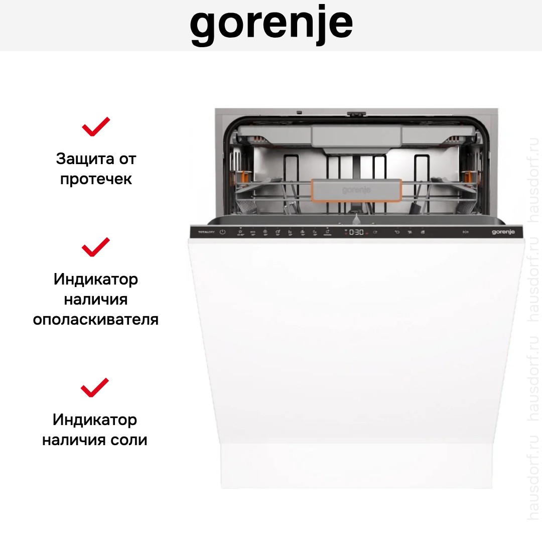 Посудомоечная машина Gorenje GV673B65 выполнена как полностью встраиваемое решение, которое прячется за фасадом вашей кухни. Ее габариты 81.6×59.8×55.5 см подходят для стандартной ниши, а регулировка по высоте учитывает зазор 82-90 см. Панель управления черная и скрыта под дверцей, поэтому видимая часть остается аккуратной и минималистичной. Отображение статуса на дисплее и индикация функций сохраняют удобство использования при закрытой панели.