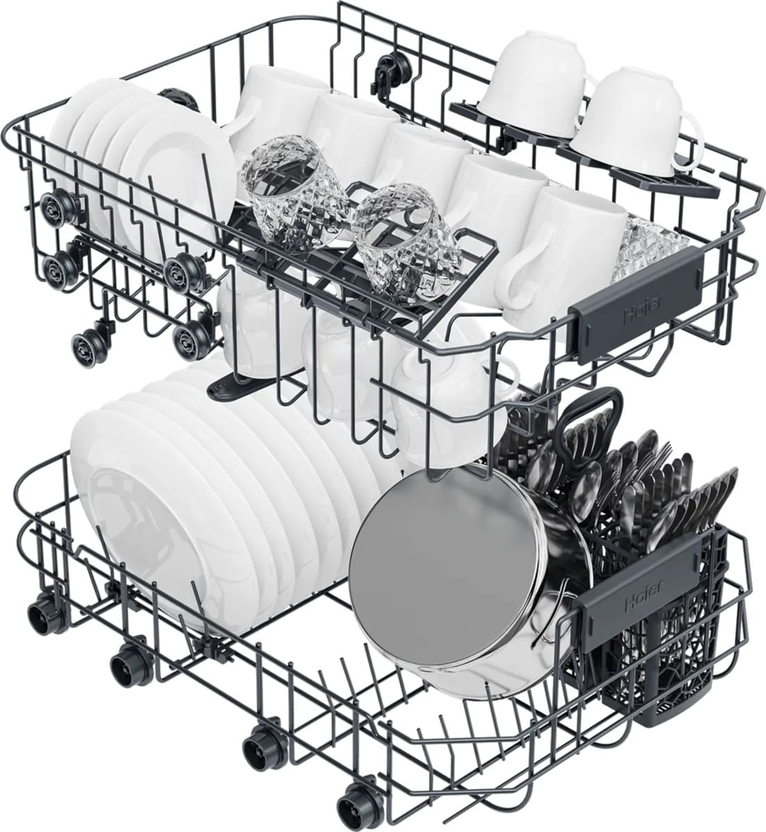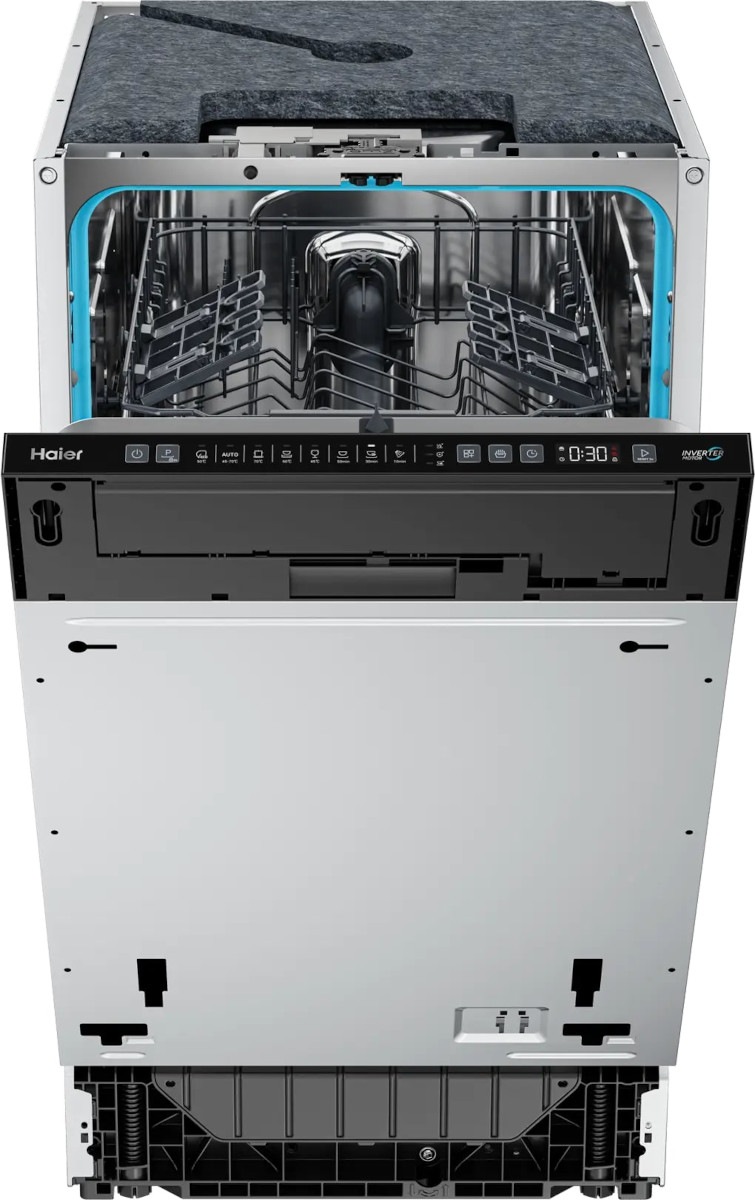 Встраиваемая модель Хайер отлично впишется в любой интерьер, главное — правильно выбрать место, чтобы подвести коммуникации. Устанавливается в нишу целиком, полностью закрывается декоративной панелью. Обратите внимание: в комплекте не идет фасад, его необходимо установить самостоятельно. Имеет уменьшенную ширину — благодаря этому поместится даже на очень маленькой кухне. В камеру можно загрузить ограниченное число комплектов: 10 шт. Комплектом считается набор посуды на одного человека, который нужен для полноценного приема пищи: глубокая и плоская тарелки, тарелка для салата, блюдце под чашку, сама чашка, ложка и вилка.