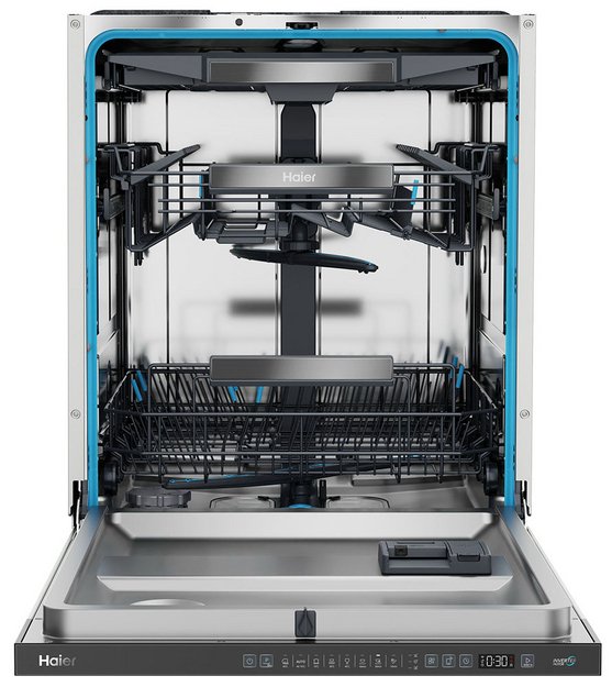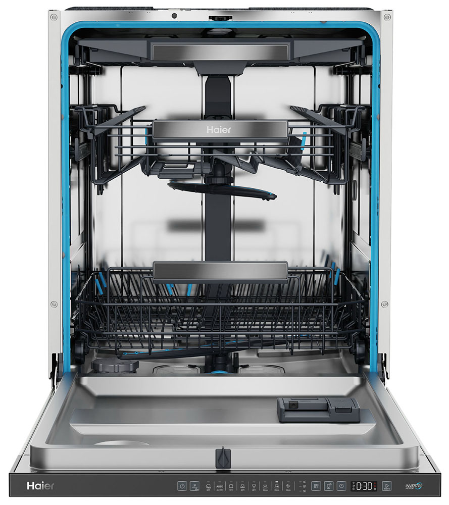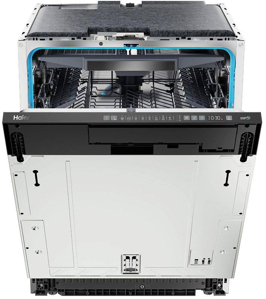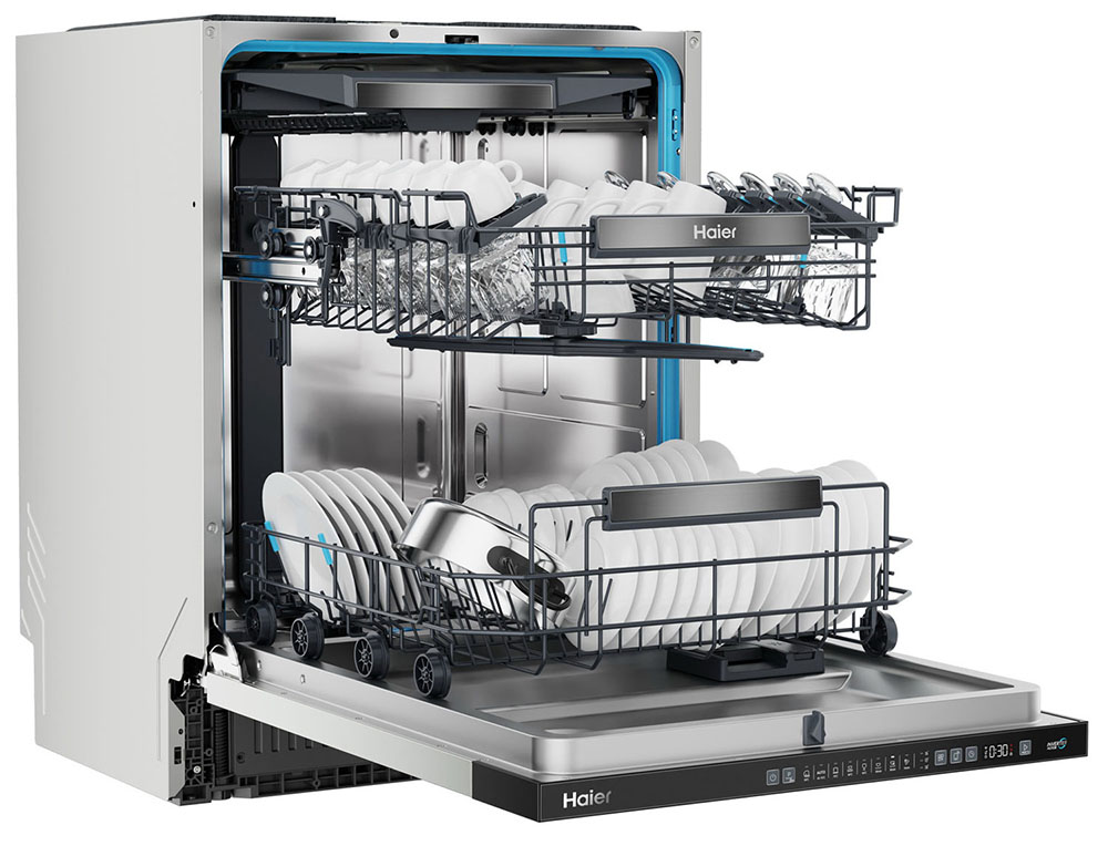 Встраиваемая модель Хайер отлично впишется в любой интерьер, главное — правильно выбрать место, чтобы подвести коммуникации. Устанавливается в нишу целиком, полностью закрывается декоративной панелью. Обратите внимание: в комплекте не идет фасад, его необходимо установить самостоятельно. Имеет стандартные размеры, поэтому может не поместиться на очень маленькой кухне. В камеру можно загрузить ограниченное число комплектов: 16 шт. Комплектом считается набор посуды на одного человека, который нужен для полноценного приема пищи: глубокая и плоская тарелки, тарелка для салата, блюдце под чашку, сама чашка, ложка и вилка.
