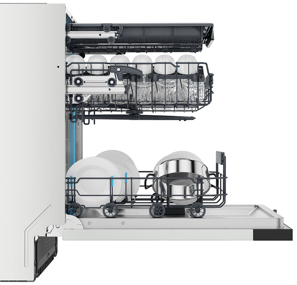 Полноразмерные модели выбирают в больших семьях, а также те, кто много готовит или часто принимает гостей. Их вместимость может составить до 15 комплектов посуды, а габаритные размеры соответствуют размерам стандартной кухонной мебели шириной и глубиной 60 см и высотой 82-85 см. Они выпускаются как во встраиваемом, так и в отдельностоящем варианте: во втором случае для установки понадобится достаточно много места. Как правило, полноразмерные приборы отличаются большим набором стандартных и специальных программ мойки, а также дополнительных опций: в частности, они оснащаются третьей корзиной для мытья столовых приборов.