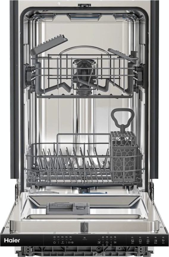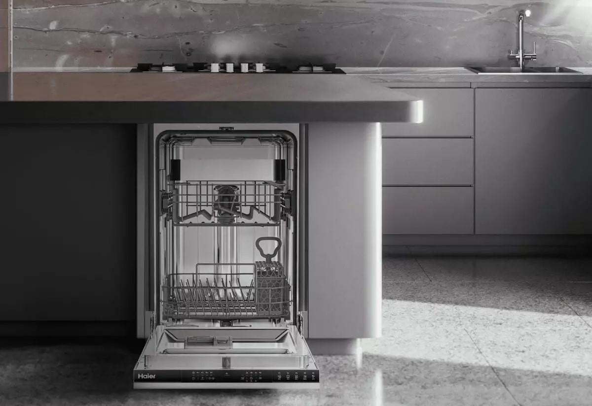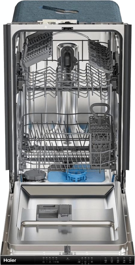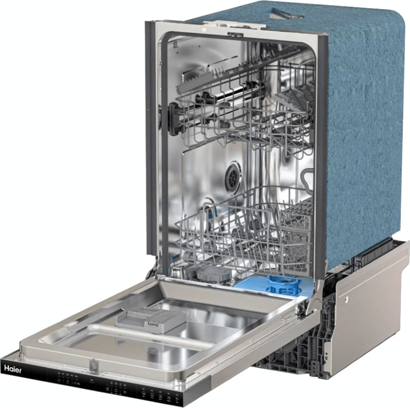 Встраиваемая модель Хайер отлично впишется в любой интерьер, главное — правильно выбрать место, чтобы подвести коммуникации. Устанавливается в нишу целиком, полностью закрывается декоративной панелью. Обратите внимание: в комплекте не идет фасад, его необходимо установить самостоятельно. Имеет уменьшенную ширину — благодаря этому поместится даже на очень маленькой кухне. В камеру можно загрузить ограниченное число комплектов: 9 шт. Комплектом считается набор посуды на одного человека, который нужен для полноценного приема пищи: глубокая и плоская тарелки, тарелка для салата, блюдце под чашку, сама чашка, ложка и вилка.