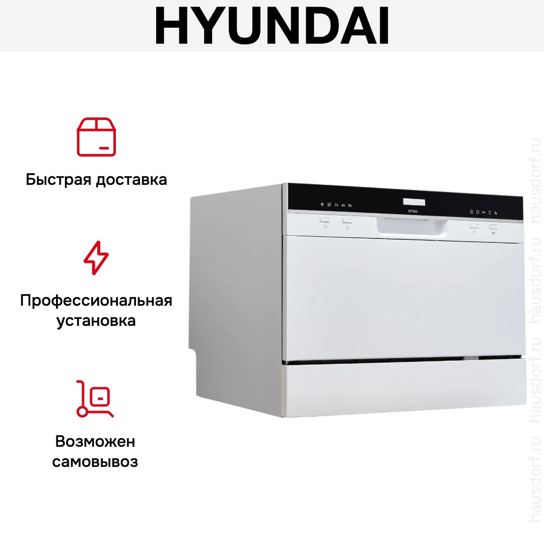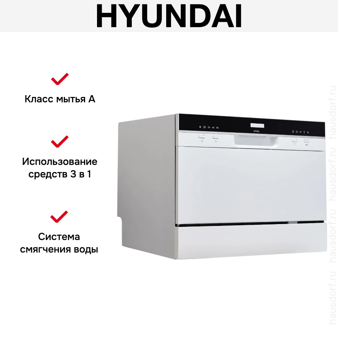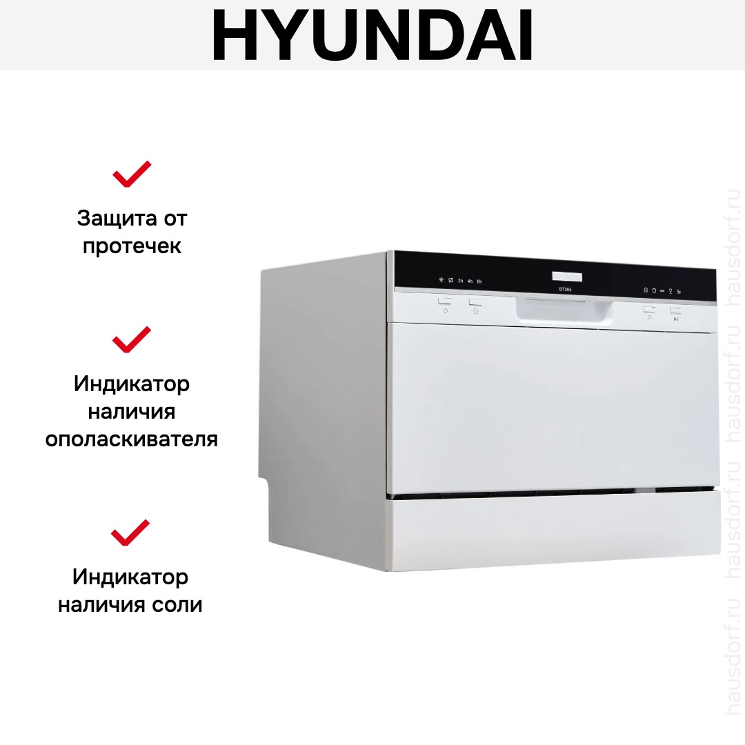 Отдельностоящая модель Хендай отлично впишется в кухонный интерьер, главное — правильно выбрать место, чтобы подвести коммуникации. Компактные размеры позволяют разместить ее даже на очень маленькой кухне. В камеру можно загрузить ограниченное число комплектов: 6 шт. Комплектом считается набор посуды на одного человека, который нужен для полноценного приема пищи: глубокая и плоская тарелки, тарелка для салата, блюдце под чашку, сама чашка, ложка и вилка.