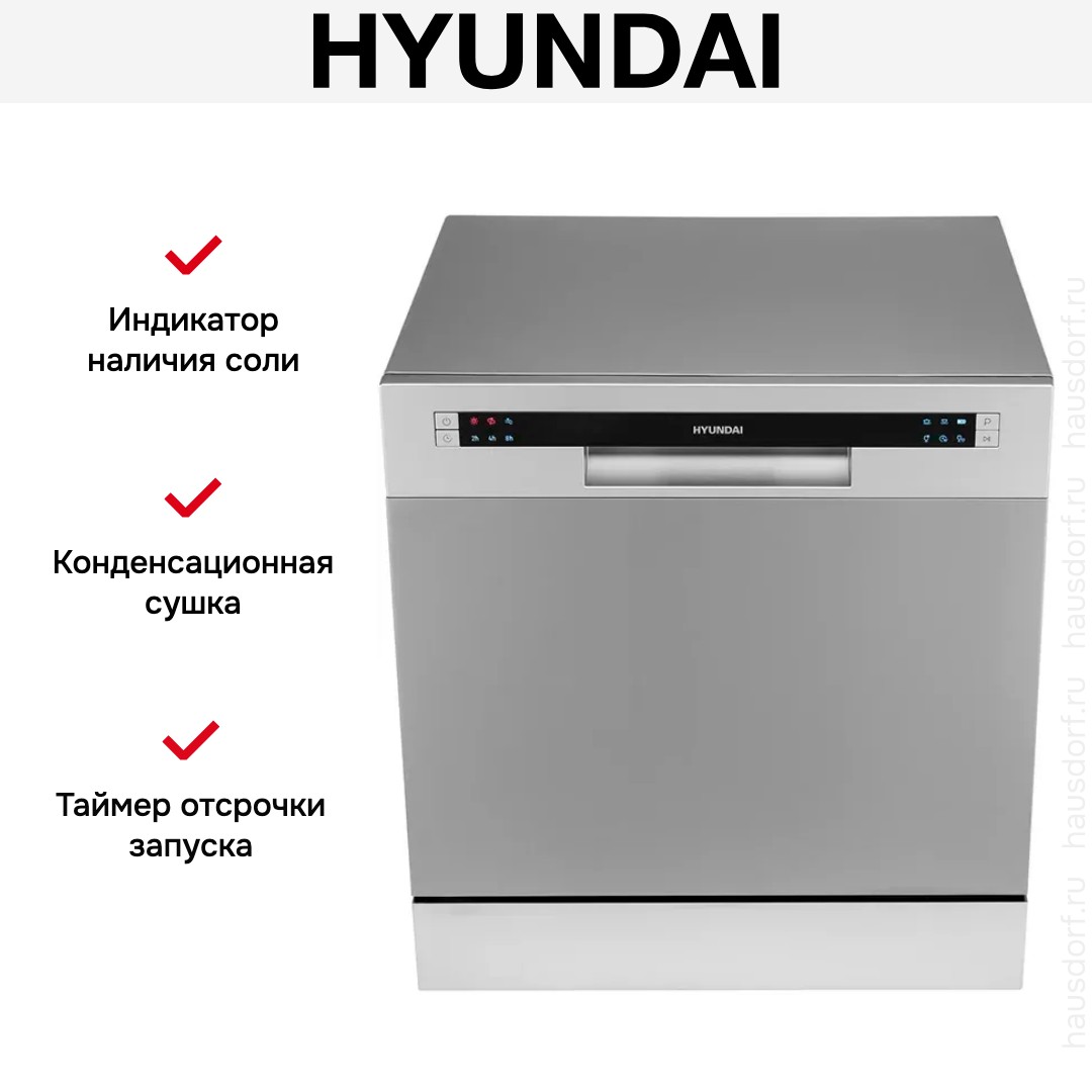 Отдельностоящая модель Хендай отлично впишется в кухонный интерьер, главное — правильно выбрать место, чтобы подвести коммуникации. Компактные размеры позволяют разместить ее даже на очень маленькой кухне. В камеру можно загрузить ограниченное число комплектов: 8 шт. Комплектом считается набор посуды на одного человека, который нужен для полноценного приема пищи: глубокая и плоская тарелки, тарелка для салата, блюдце под чашку, сама чашка, ложка и вилка.