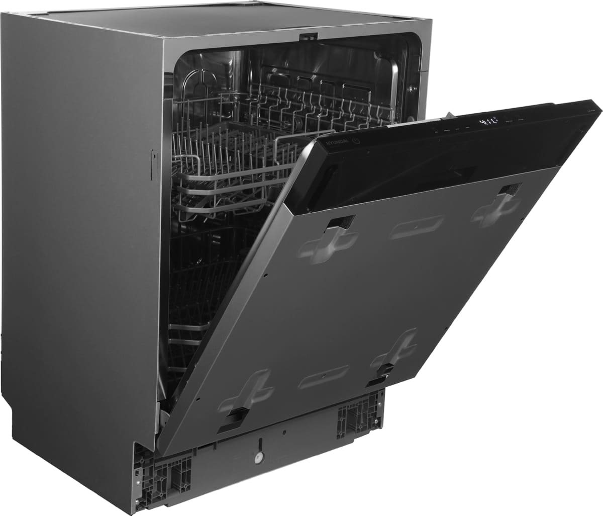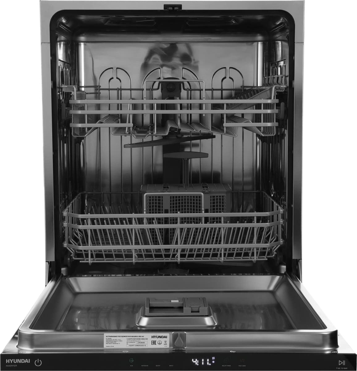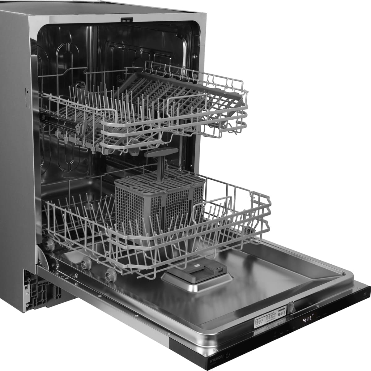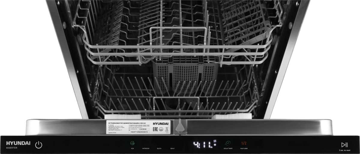 Встраиваемая модель Хендай отлично впишется в любой интерьер, главное — правильно выбрать место, чтобы подвести коммуникации. Устанавливается в нишу целиком, полностью закрывается декоративной панелью. Обратите внимание: в комплекте не идет фасад, его необходимо установить самостоятельно. Имеет стандартные размеры, поэтому может не поместиться на очень маленькой кухне. В камеру можно загрузить ограниченное число комплектов: 13 шт. Комплектом считается набор посуды на одного человека, который нужен для полноценного приема пищи: глубокая и плоская тарелки, тарелка для салата, блюдце под чашку, сама чашка, ложка и вилка.