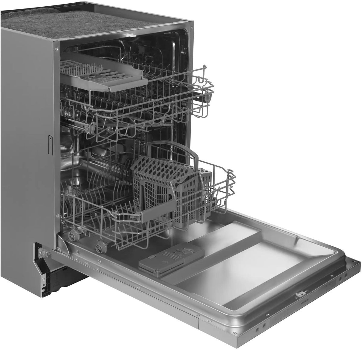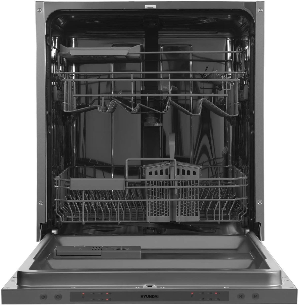 Встраиваемая модель Хендай отлично впишется в любой интерьер, главное — правильно выбрать место, чтобы подвести коммуникации. Устанавливается в нишу целиком, полностью закрывается декоративной панелью. Обратите внимание: в комплекте не идет фасад, его необходимо установить самостоятельно. Имеет стандартные размеры, поэтому может не поместиться на очень маленькой кухне. В камеру можно загрузить ограниченное число комплектов: 14 шт. Комплектом считается набор посуды на одного человека, который нужен для полноценного приема пищи: глубокая и плоская тарелки, тарелка для салата, блюдце под чашку, сама чашка, ложка и вилка.