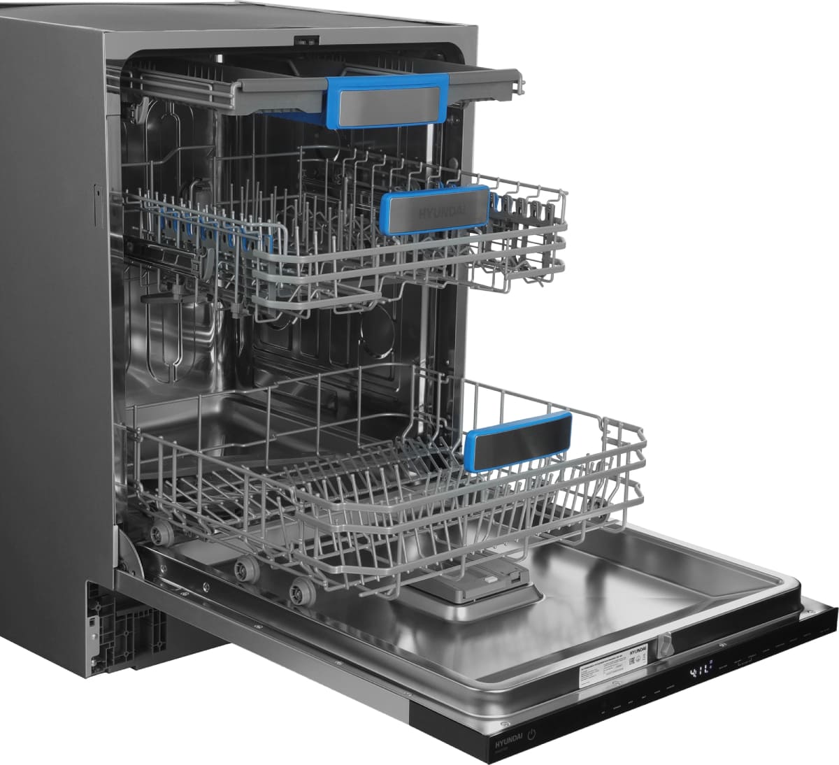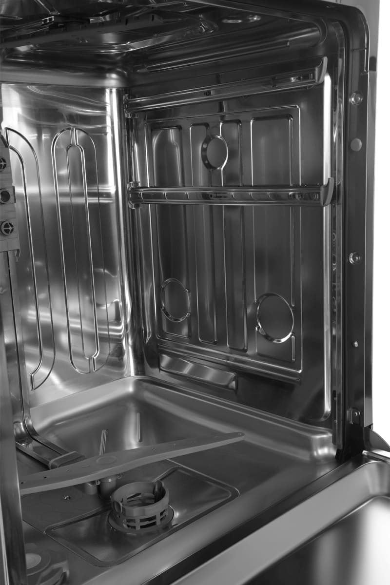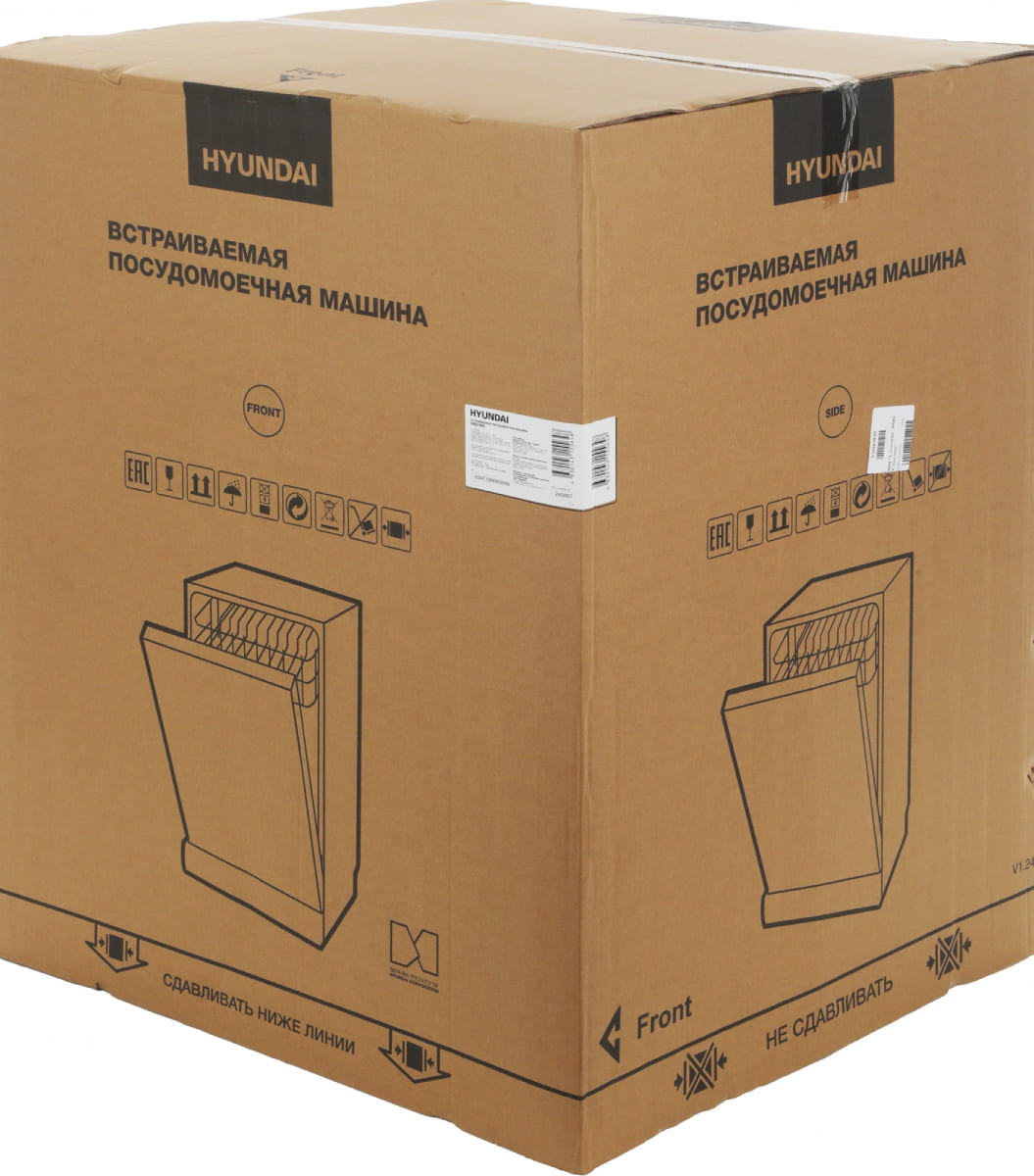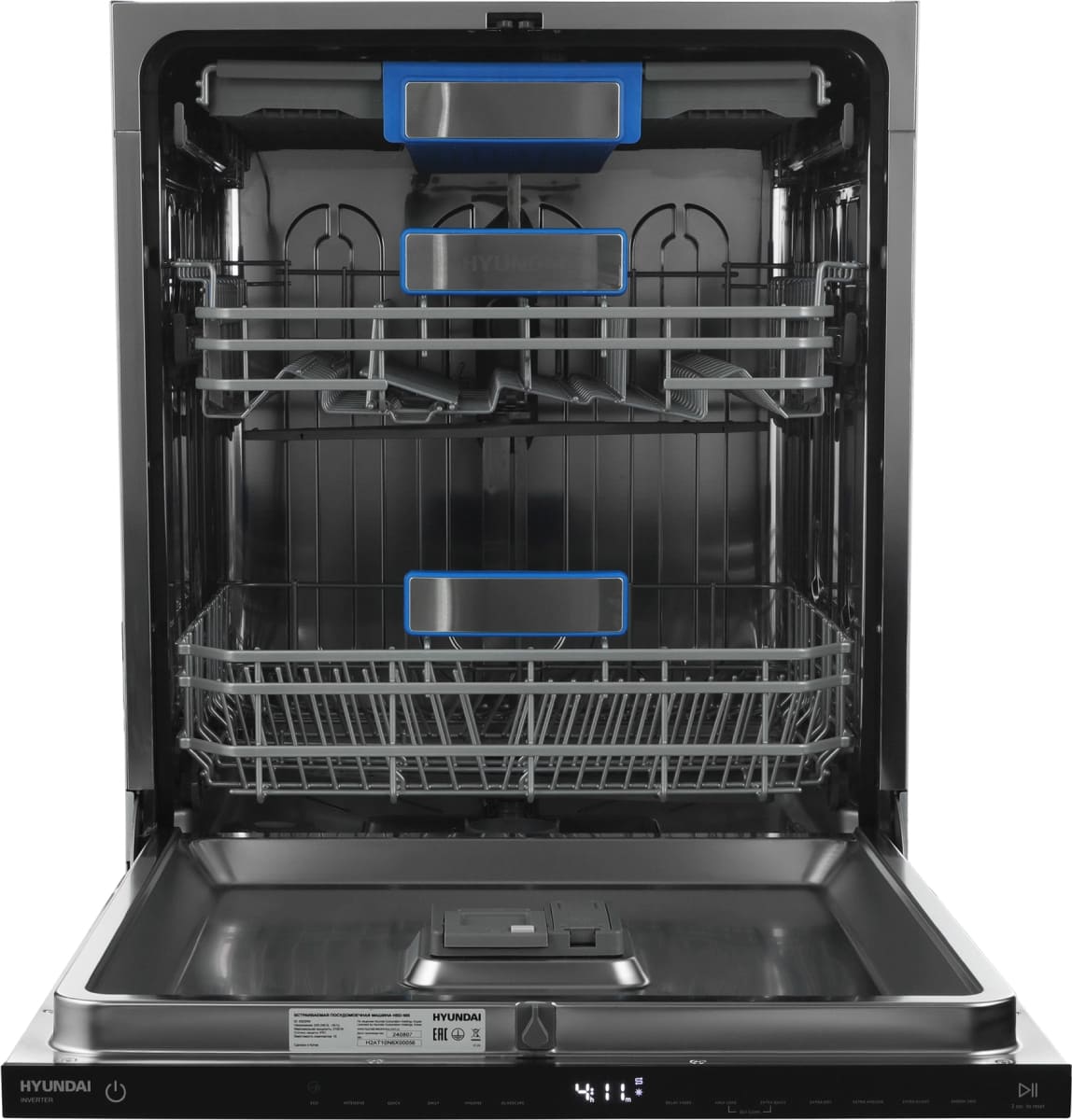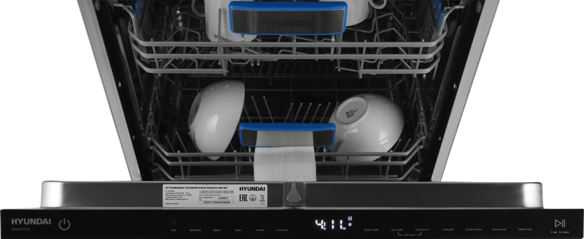Встраиваемая модель Хендай отлично впишется в любой интерьер, главное — правильно выбрать место, чтобы подвести коммуникации. Устанавливается в нишу целиком, полностью закрывается декоративной панелью. Обратите внимание: в комплекте не идет фасад, его необходимо установить самостоятельно. Имеет стандартные размеры, поэтому может не поместиться на очень маленькой кухне. В камеру можно загрузить ограниченное число комплектов: 16 шт. Комплектом считается набор посуды на одного человека, который нужен для полноценного приема пищи: глубокая и плоская тарелки, тарелка для салата, блюдце под чашку, сама чашка, ложка и вилка.
