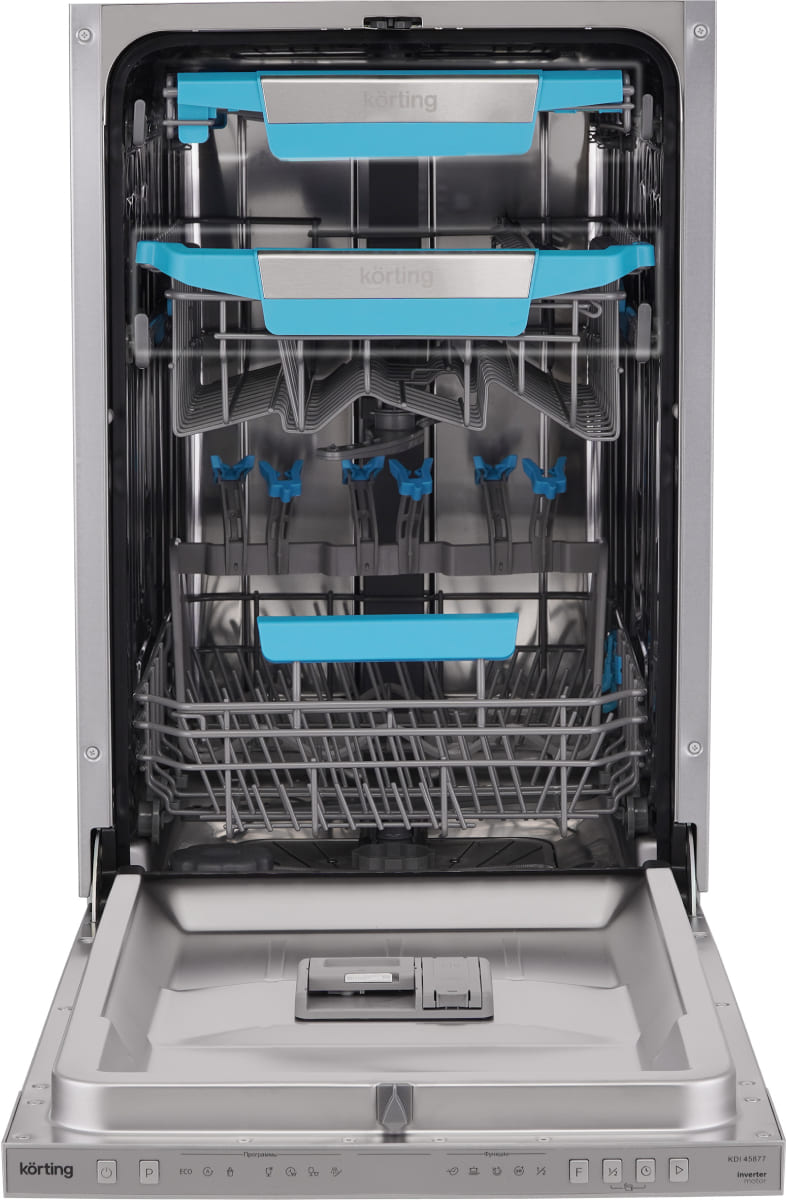 Встраиваемая модель Кертинг отлично впишется в любой интерьер, главное — правильно выбрать место, чтобы подвести коммуникации. Устанавливается в нишу целиком, полностью закрывается декоративной панелью. Обратите внимание: в комплекте не идет фасад, его необходимо установить самостоятельно. Имеет уменьшенную ширину — благодаря этому поместится даже на очень маленькой кухне. В камеру можно загрузить ограниченное число комплектов: 10 шт. Комплектом считается набор посуды на одного человека, который нужен для полноценного приема пищи: глубокая и плоская тарелки, тарелка для салата, блюдце под чашку, сама чашка, ложка и вилка.