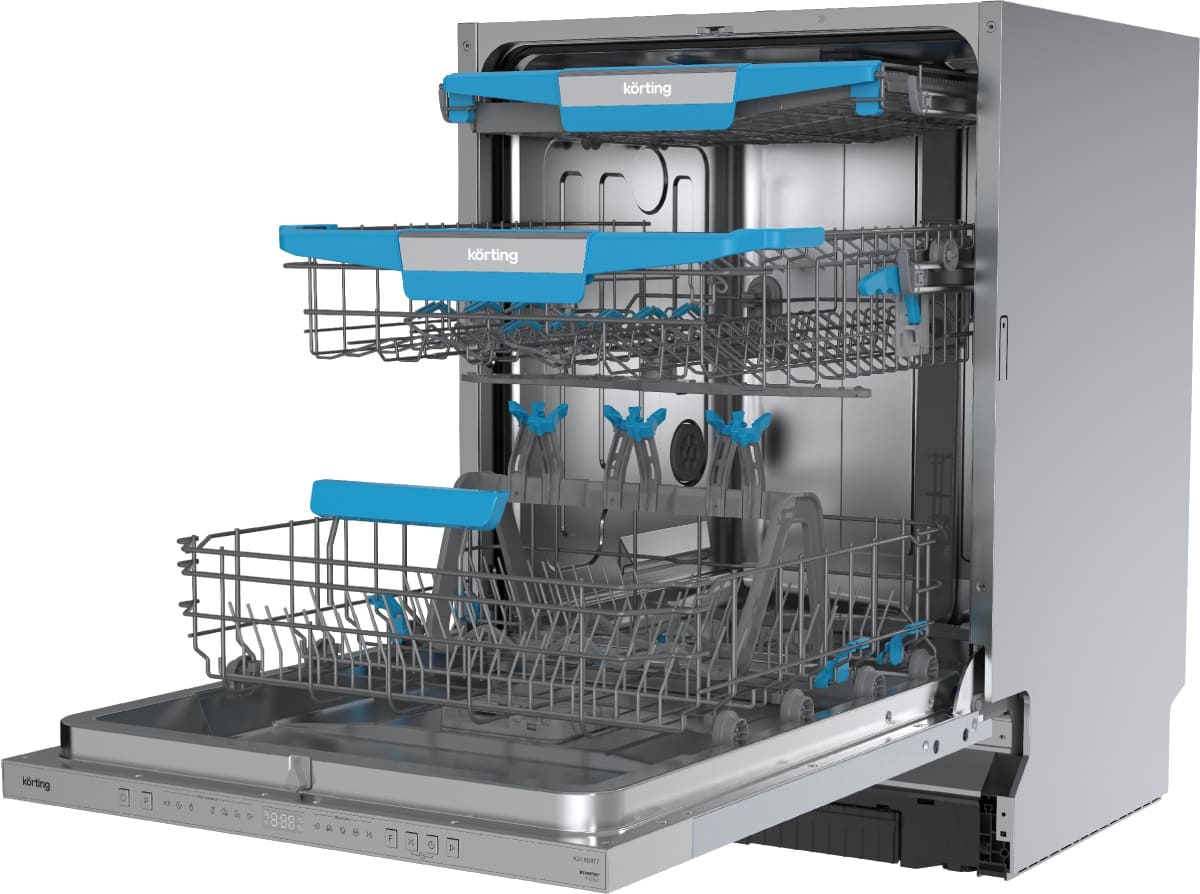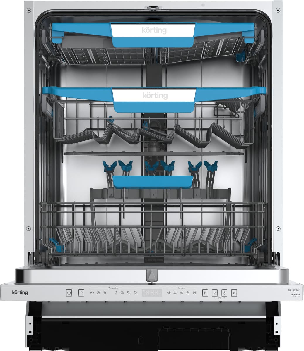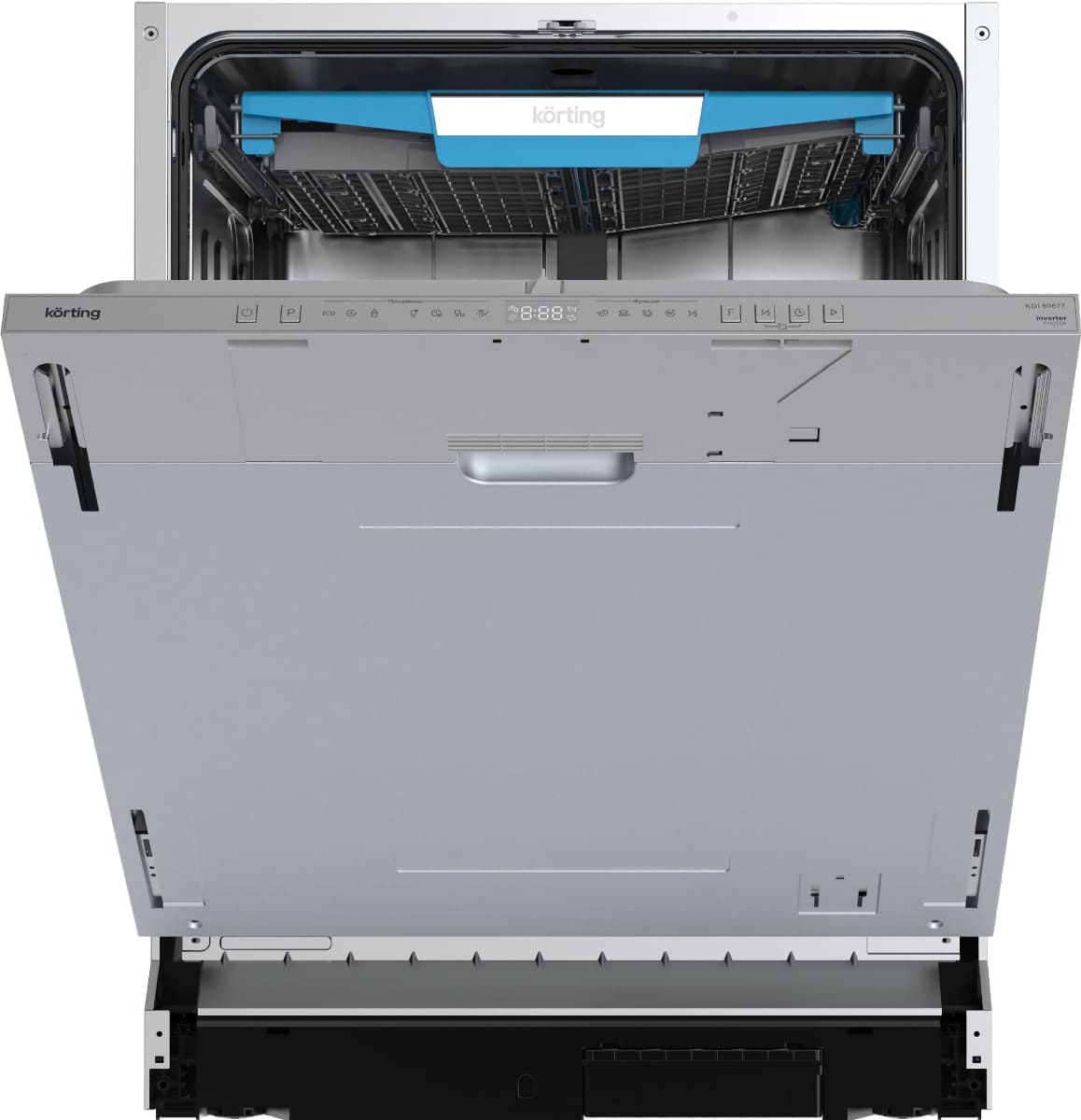 Встраиваемая посудомоечная машина Korting KDI 60877 — это гармоничное сочетание лаконичного дизайна и продуманной функциональности, созданное для тех, кто ценит порядок и заботится о комфорте на кухне: полностью встраиваемая конструкция позволяет скрыть агрегат за фасадом мебели, сохраняя единый стиль интерьера, а серебристая панель управления с цифровым дисплеем аккуратно прячется за дверцей, чтобы не нарушать внешний вид гарнитура. Корпус полноразмерного устройства оснащён регулируемыми ножками, что облегчает монтаж в нише 82—88×60×55 см, а габариты 81.5×59.8×55 см при глубине открытой двери 115 см обеспечивают удобный доступ к внутреннему пространству; вместимость до 14 комплектов делает аппарат отличным решением для семей и активных хозяек. Внутреннее наполнение продуманно: верхняя корзина регулируется по высоте, есть полочка для чашек, полка для столовых приборов, направляющие для тарелок в обоих коробах и дополнительный фиксатор для мытья бокалов — всё это обеспечивает бережное обращение с хрупкой посудой. Для наиболее эффективного распределения струй применены S-Form разбрызгиватели, а верхний распылитель повышает качество очистки. Набор программ широкий: семь стандартных циклов предусмотрены для любых потребностей — автоматические режимы, интенсивная мойка для стойких загрязнений, щадящая процедура для деликатных предметов, быстрая санобработка, половинная загрузка, предварительное полоскание и специализированная программа Baby Care для заботы о посуде малышей; есть также экономичная опция и функция «Экономия времени», что позволяет выбирать оптимальный баланс между расходом ресурсов и скоростью. Техническая начинка соответствует современным стандартам: инверторный мотор снижает шум и износ, уровень звука составляет 42 дБ, а активная сушка с опцией Экстра-сушка и режимом Turbo+ обеспечивает сухость без дополнительных усилий; проточный водонагреватель ускоряет нагрев воды, а возможность использования таблеток 3 в 1 упрощает уход. Параметры расхода впечатляют экономичностью — всего 10.8 л воды за цикл и 0.849 кВт·ч электроэнергии, что в сумме даёт класс энергопотребления A+++; годовые показатели также приемлемы: 3024 л воды и 242 кВт·ч в год. Управление электронное, панель закрытая, кнопки включения и выбора программ интуитивны, есть таймер отсрочки старта от 1 до 24 часов, цифровой экран информирует о времени до окончания, а индикаторы наличия соли и ополаскивателя помогут не забыть об обслуживании; световой сигнал завершения и «Луч на полу» оповестят о готовности, при отсутствии подачи воды сработает соответствующая индикация. Безопасность реализована через систему AquaControl и автоматическое отключение при неисправностях, фильтр защищает систему слива, а в комплекте идут тестер жёсткости воды, заливной и сливной шланги (1.6 и 1.4 м), что облегчает установку. Надёжность подтверждается тщательной продуманностью деталей: направляющие для тарелок и дополнительные фиксаторы обеспечивают стабильность во время мойки, а функция предварительного полоскания и эталонный цикл Eco 50°C с длительностью 198 минут дают выбор между деликатным и интенсивным уходом. Вес модели 38 кг (брутто 43 кг) делает её устойчивой и надёжной при эксплуатации, а классы мытья и сушки A гарантируют высокое качество результата. Этот компактный, но вместительный прибор и