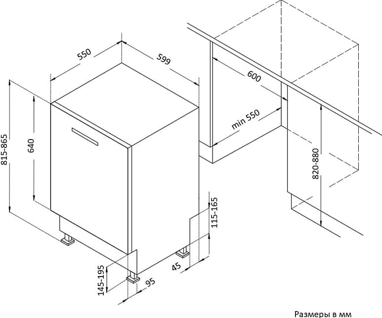 - Размеры ниши для встраивания (ВхШхГ): 82-88х45х55 см