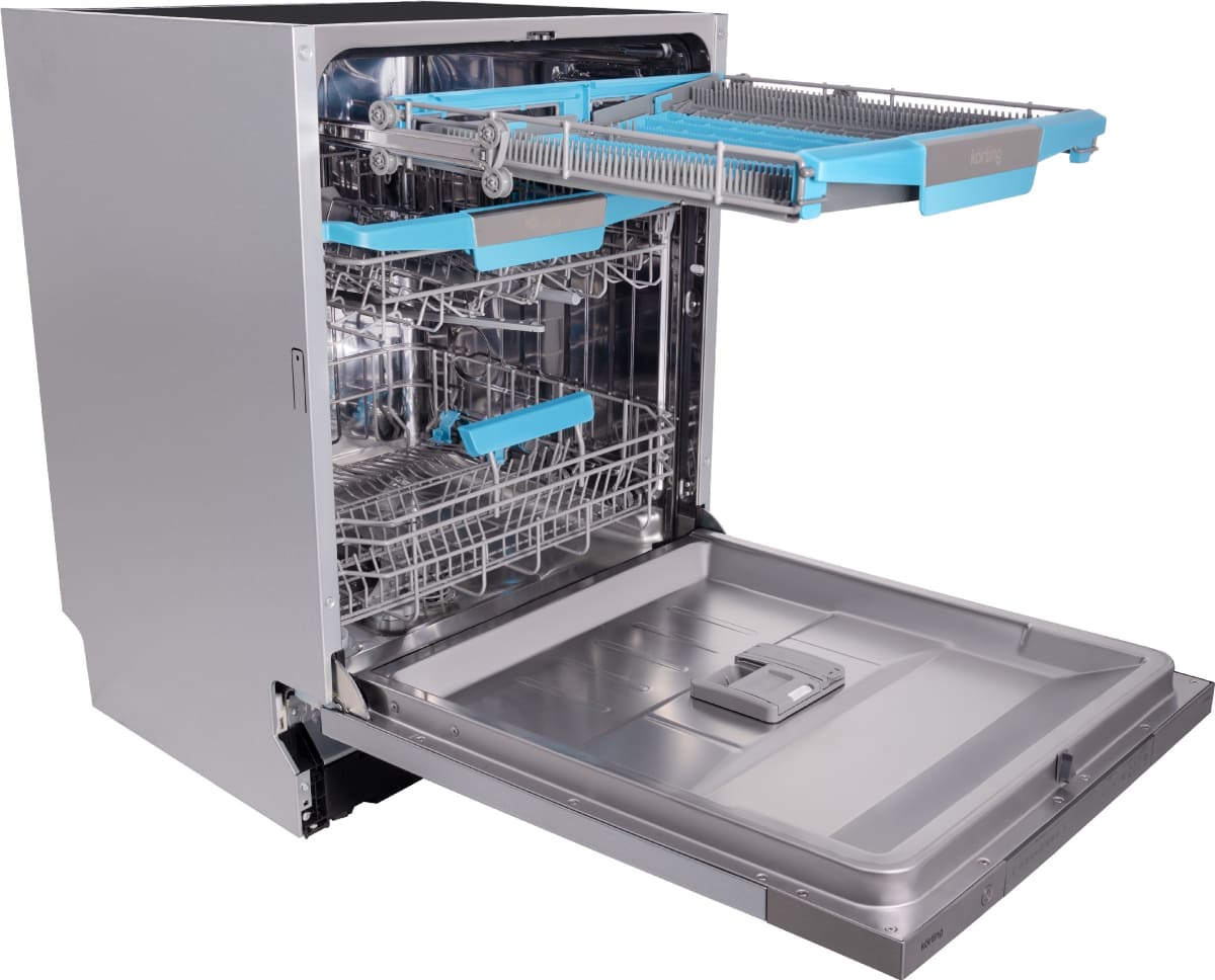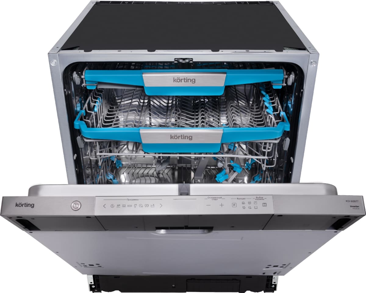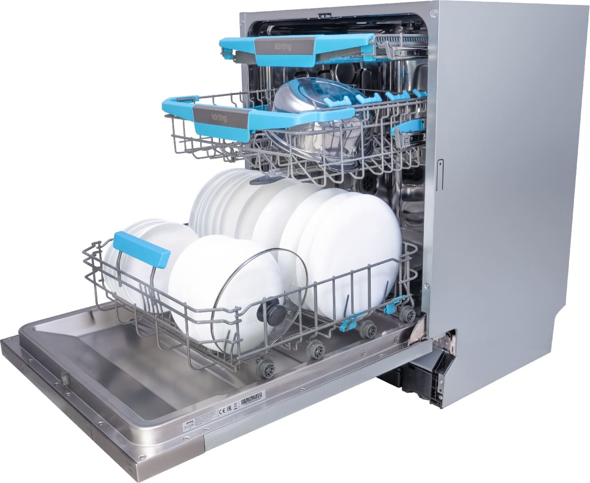 Встраиваемая модель Кертинг отлично впишется в любой интерьер, главное — правильно выбрать место, чтобы подвести коммуникации. Устанавливается в нишу целиком, полностью закрывается декоративной панелью. Обратите внимание: в комплекте не идет фасад, его необходимо установить самостоятельно. Имеет стандартные размеры, поэтому может не поместиться на очень маленькой кухне. В камеру можно загрузить ограниченное число комплектов: 14 шт. Комплектом считается набор посуды на одного человека, который нужен для полноценного приема пищи: глубокая и плоская тарелки, тарелка для салата, блюдце под чашку, сама чашка, ложка и вилка.