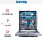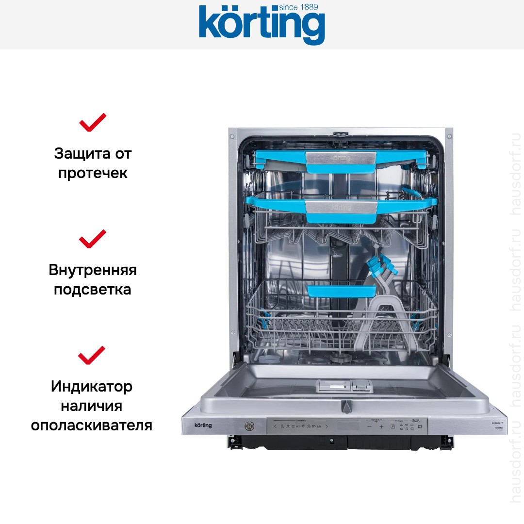 Korting KDI 60977 — элегантное решение для современной кухни: полностью встраиваемый прибор с закрытой серебристой панелью управления аккуратно прячет управление и сохраняет стилевую целостность мебели, при этом внутренняя подсветка делает процесс загрузки и контроля более удобным. Корпус полноразмерного агрегата рассчитан на нишу 82—88×60×55 см и имеет стандартные габариты 81.5×59.8×55 см, глубина с открытой дверью 115 см позволяет свободно маневрировать при загрузке верхнего и нижнего боксов; регулирование высоты корзины обеспечивает больше свободы для высоких предметов, а направляющие и полочки для чашек и столовых приборов гарантируют аккуратное расположение сервировочной посуды. Вместимость 14 комплектов и восемь стандартных программ — от деликатной и быстрой мойки до интенсивной и гигиеничной — дают универсальность при любых сценариях, а режим половинной загрузки экономит ресурсы при неполной комплектации. Система S-Form разбрызгивателей и верхний распылитель обеспечивают мойку в любом коробе, дополнительный фиксатор для бокалов и полка для столовых приборов бережно ухаживают за стеклом и столовыми предметами. Технологичные решения включают инверторный мотор, проточный водонагреватель и возможность использования средств 3 в 1, что повышает эффективность расхода энергии и силы струи; автоматическое открытие дверцы по окончании цикла помогает улучшить процесс сушки, дополненный активной системой сушки и функциями Экстра-сушка и Турбо+ для ускорения и экономии. Электронное управление с цифровым дисплеем и сенсорной панелью Touch Control предоставляет точный выбор программ и таймер от 1 до 24 часов для удобного планирования, индикаторы наличия соли и ополаскивателя, световой сигнал окончания, индикатор «луч на полу» и контроль отсутствия подачи воды облегчают обслуживание и предотвращают неполадки. Энергоэффективность класса A+++ при расходе воды всего 9.8 л за цикл и уровне шума 42 дБ делает прибор бережным к ресурсам и комфортным в быту; энергопотребление 0.747 кВт·ч за цикл и годовой расход воды 2744 л соответствуют современным стандартам экономии. В комплектацию входят тестер жесткости воды, заливной и сливной шланги (1.6 м и 1.4 м), встроенный фильтр и дополнительные направляющие, а система AquaControl обеспечивает защиту от протечек с автоматическим отключением. Продуманная эргономика, многофункциональность и внимание к деталям создают устойчивое впечатление надежности: прибор сочетает аккуратный внешний вид, удобную интеграцию под фасад и широкий набор опций для бережной и эффективной уборки посуды, гарантирующих чистоту и комфорт каждый день.