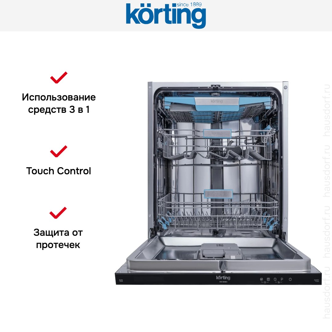 Посудомоечная машина Korting KDI 60984 представлена как современное встроенное решение для полноценной кухни: полностью интегрируемый корпус с закрытой черной панелью управления гармонично прячет органы управления и цифровой дисплей, оставляя место для фасада вашего гарнитура и обеспечивая аккуратный внешний вид. Компактные, но практичные габариты 81.5×59.8×55 см при глубине с открытой дверью 115 см и возможности встраивания в нишу 82—88×60×55 см делают прибор удобным для стандартной кухонной мебели, а регулируемые по высоте ножки обеспечивают точную подгонку. Дизайн внутреннего пространства продуман: три уровня расположения посуды с верхней полкой для столовых приборов и полочкой для чашек в верхнем коробе, направляющие для тарелок в двух ярусах и специальная зона для мытья бутылок и стаканов дают гибкость при расстановке предметов. Вместимость до 14 комплектов позволяет легко справляться с семейными ужинами, а регулируемая корзина и функция «мойка в любой корзине» повышают универсальность загрузки. Инновационный набор распылителей S-Form и верхний распылитель в сочетании с инверторным мотором и проточным водонагревателем обеспечивают равномерное распределение воды и мощное смывание загрязнений без лишнего шума — уровень всего 42 дБ. Для разных типов загрязнений предусмотрено восемь стандартных программ, включая гигиеничный режим, автоматические циклы, интенсивную мойку, щадящую программу для деликатной посуды, режим для слабозагрязненной посуды, половинную загрузку, быструю стирку и стандартное мытье с предварительным ополаскиванием; эталонный Eco 50°C длится 198 минут. Электронное управление с touch control и цифровым дисплеем, таймер отсрочки 1-24 часа, индикаторы наличия ополаскивателя и соли и сигнал о недостатке жидкого моющего средства упрощают ежедневную эксплуатацию, а автодозирование жидкого средства и поддержка средств «3 в 1» добавляют удобства. Безопасность и надежность подтверждаются AquaControl, автоматическим отключением и фильтром для защиты от засоров, а автоматическое открытие двери в конце цикла помогает ускорить сушку при активном способе сушки и функции Turbo+. В комплект входят тестер жесткости воды, заливной и сливной шланги длиной 1.6 и 1.4 м соответственно, что облегчает подключение. Экономичные параметры впечатляют: расход воды 9.8 л за цикл, годовой расход 2744 л, энергопотребление 0.645 кВт·ч за цикл и 184 кВт·ч в год при классе A+++, класс мытья и сушки A; максимальная потребляемая мощность — 2100 Вт. Дополнительные преимущества — внутренняя подсветка, возможность использования специальных фиксирующих элементов для мытья бокалов и автодозирование, а также наличие функции Турбо+ для ускоренных задач, что делает прибор удобным и функциональным решением для тех, кто ценит сочетание эстетики и эффективности в бытовой технике Korting.