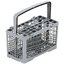 Корзина для столовых приборов — один из обязательных аксессуаров, которыми оснащается любая посудомоечная машина. Она представляет собой сетчатый пластиковый органайзер, в котором устанавливаются в вертикальном положении ложки, ножи и вилки. Корзина, как правило, разделяется на отдельные отсеки, в каждый из которых можно поместить один или несколько предметов. Зачастую сверху она закрывается специальной крышкой, которая также служит для разделения приборов, способствуя более тщательному их мытью.