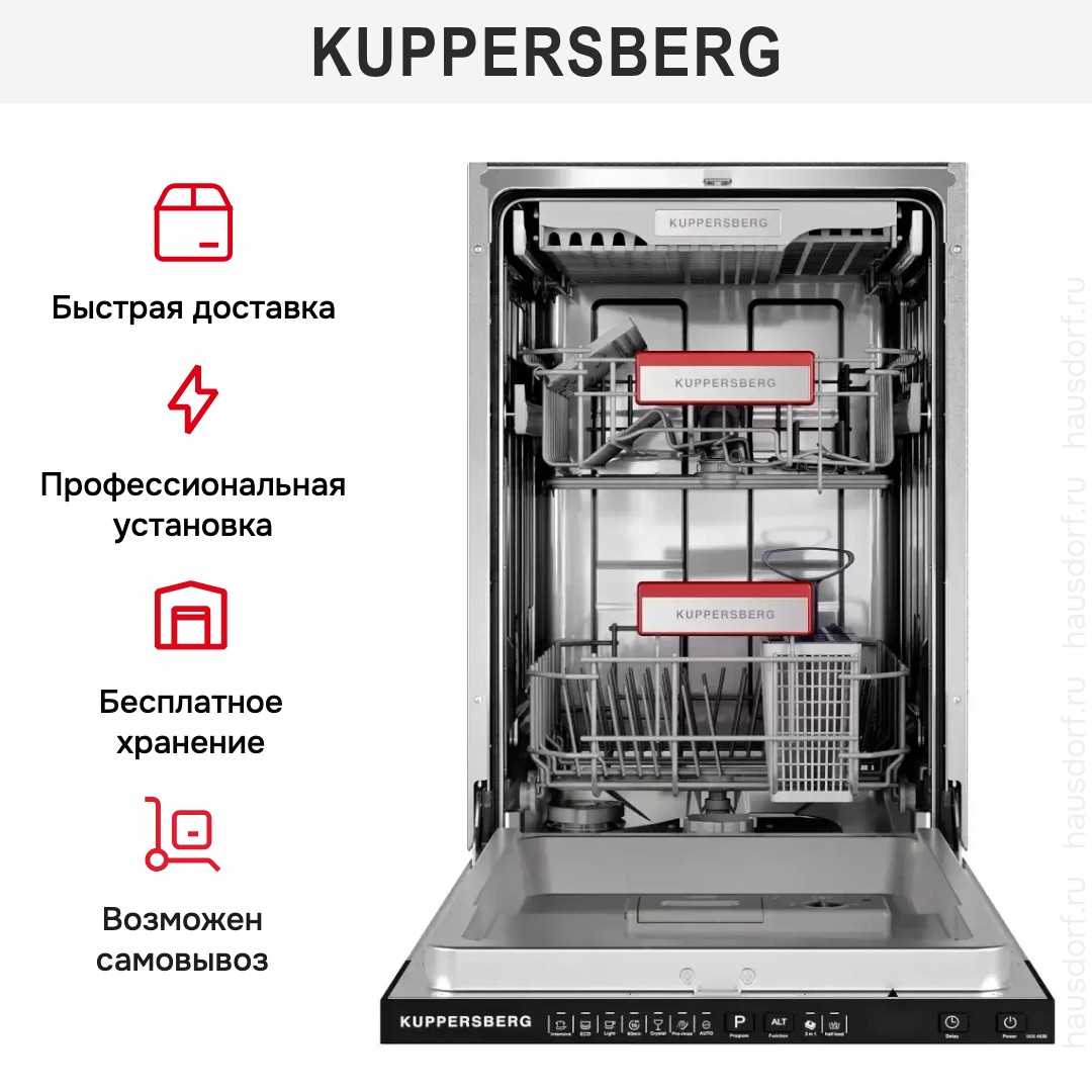 Встраиваемая посудомоечная машина Kuppersberg GGS 4535 — интеллектуальное устройство, созданное для безупречной чистоты кухонной утвари в условиях ограниченного пространства. Высота корпуса всего 45 см делает её идеальной для компактных кухонь, мини-кухонь или второго санузла с кухонной зоной, не жертвуя при этом функциональностью. Несмотря на уменьшенные габариты, модель вмещает до 10 комплектов посуды, что вполне достаточно для ежедневного использования небольшой семьёй или парой.