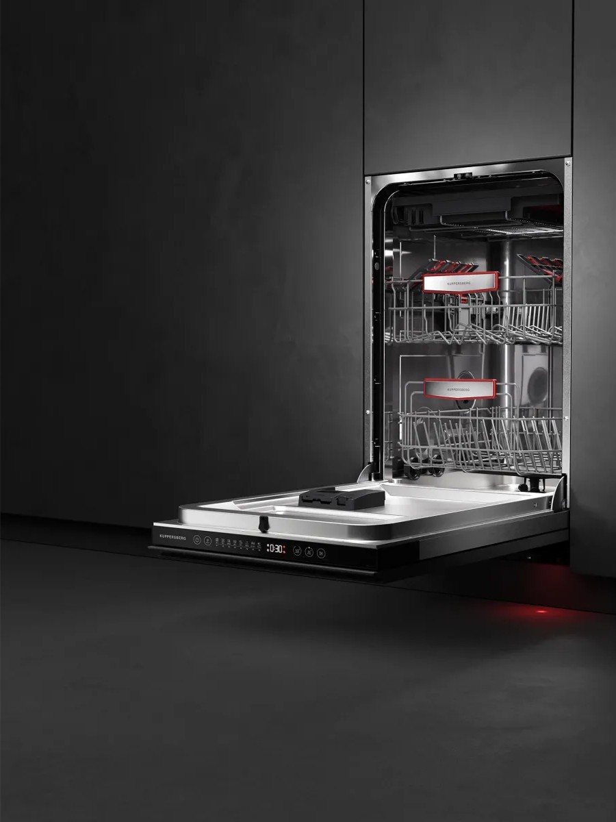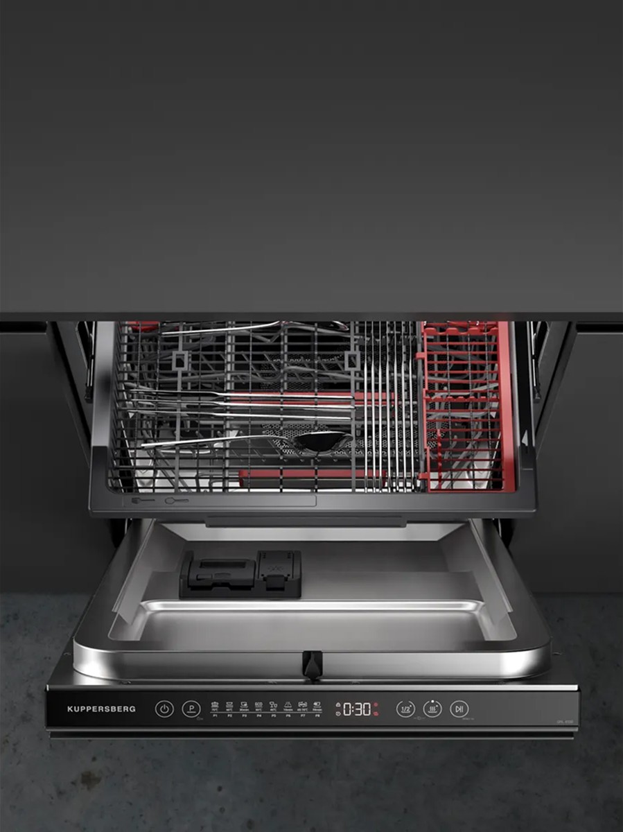 Встраиваемая модель Куперсберг отлично впишется в любой интерьер, главное — правильно выбрать место, чтобы подвести коммуникации. Устанавливается в нишу целиком, полностью закрывается декоративной панелью. Обратите внимание: в комплекте не идет фасад, его необходимо установить самостоятельно. Имеет уменьшенную ширину — благодаря этому поместится даже на очень маленькой кухне. В камеру можно загрузить ограниченное число комплектов: 11 шт. Комплектом считается набор посуды на одного человека, который нужен для полноценного приема пищи: глубокая и плоская тарелки, тарелка для салата, блюдце под чашку, сама чашка, ложка и вилка.