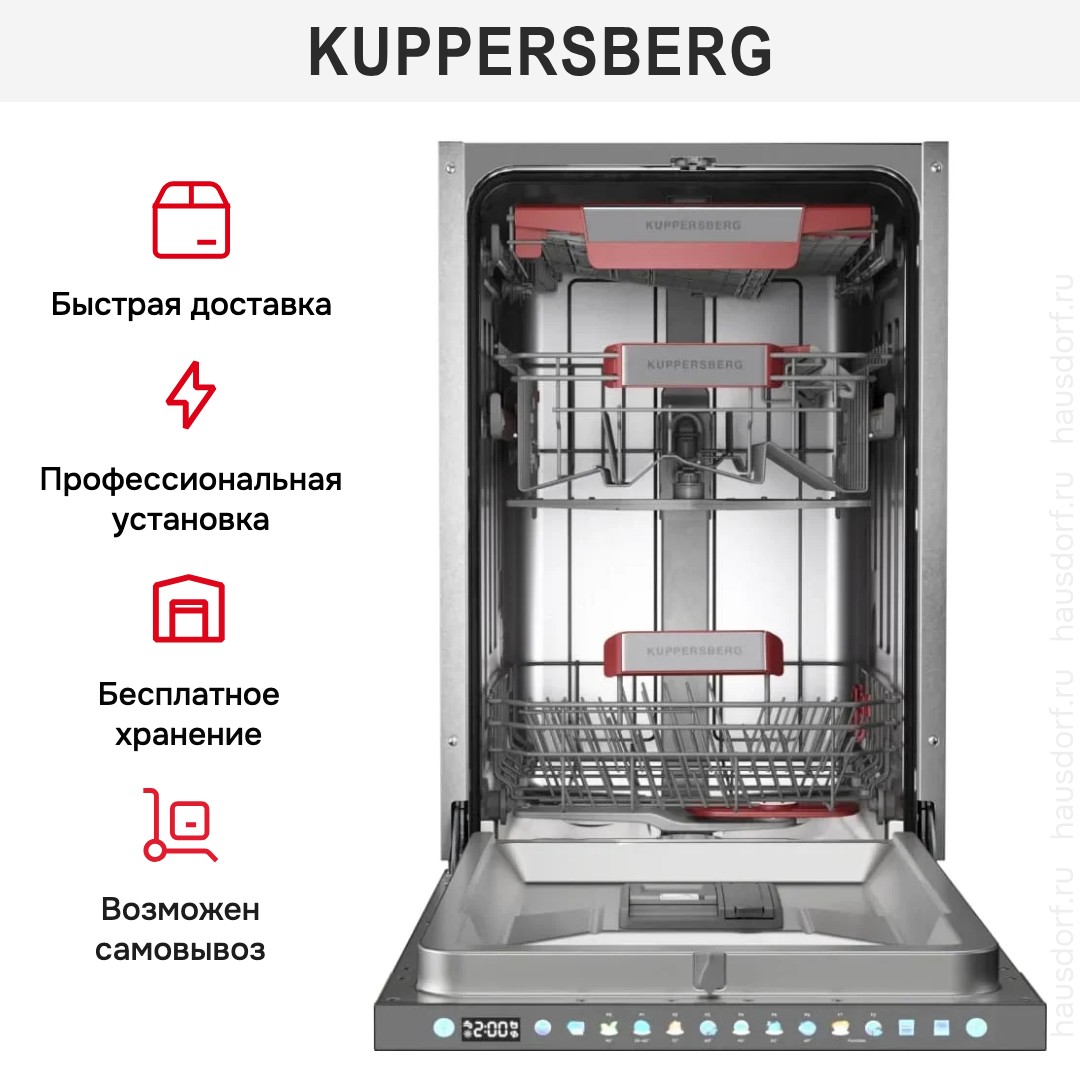 Встраиваемая посудомоечная машина Kuppersberg GIM 4595 создана для тех, кто ценит компактность, надежность и продуманный функционал: при ширине 44.8 см и глубине 55 см она идеально вписывается в узкую нишу 82×45×58 см, занимая высоту 81.5 см и предоставляя при открытой дверце рабочую длину 115 см; корпус рассчитан на полностью встраиваемую установку с слайдерным креплением фасада, что обеспечивает аккуратный внешний вид под навес вашего фасада и серебристую панель управления, скрытую за дверцей для минималистичного интерьера. Дизайн сочетает практичность и технологичность: внутреннее пространство с подсветкой оборудовано регулироваемой по высоте корзиной и полкой для столовых приборов, чашек и тарелок в обоих коробах, а направляющие упрощают загрузку габаритной посуды; установлен инверторный мотор, обеспечивающий тихую работу (44 дБ) и долговечность, а также низкое энергопотребление класса A+++ (156 кВт·ч/год) при максимальной мощности 2100 Вт. Техника предлагает вместимость 10 комплектов и гибкую программу мойки: семь температурных режимов и семь стандартных циклов, среди которых быстрый 58 минут, ночной режим и эталонный Eco 45°C с продолжительностью 225 минут; доступны автоматические варианты, интенсивная и деликатная мойка, а также гигиеническая опция для тщательного обеззараживания. Система сушки конденсационная в сочетании с классом сушки A и дополнительной функцией «Экстра-сушка» обеспечивает сухость даже у сложных предметов, а совместимость со средствами 3 в 1 и наличие системы смягчения воды облегчают уход и улучшают результат. Управление полностью электронное: закрытая панель с LED-дисплеем и сенсорными элементами, кнопки Вкл./Выкл. и выбора программ, таймер отсрочки 1-24 часа, а также индикация уровня соли и ополаскивателя, сигнал окончания в виде светового уведомления и фирменный «луч на полу» помогают контролировать процесс без лишних действий. Надежность дополнена полной защитой от протечек, автоматическим отключением, регулируемыми ножками и плавным открытием/закрытием дверцы; предусмотрена функция самоочистки фильтра и съемные распылители, в том числе дополнительный Plus Wash для улучшенной обработки сложных загрязнений. Эксплуатационные показатели впечатляют экономичностью: расход воды на цикл всего 8 л (годовой объем 2240 л), энергозатраты на цикл 0.546 кВт·ч, компактный брутто-вес 39.2 кг и базовая комплектация — воронка для соли, монтажный комплект, заливной и сливной шланги — упрощают монтаж и обслуживание. Дополнительные возможности включают автооткрытие дверцы по окончании программы для естественной сушки, настройку дозировки ополаскивателя и индикатор отсутствия воды, а фильтр и полнофункциональные коромысла гарантируют стабильный результат. Этот аппарат рассчитан на стандартную сеть 220-240 В, 50 Гц и обеспечит удобство ежедневного использования благодаря эргономичным корзинам, простому доступу к пятнам и экономичным режимам, совмещая компактность, высокий класс мойки A и современный функционал от Kuppersberg; артикул 8580.