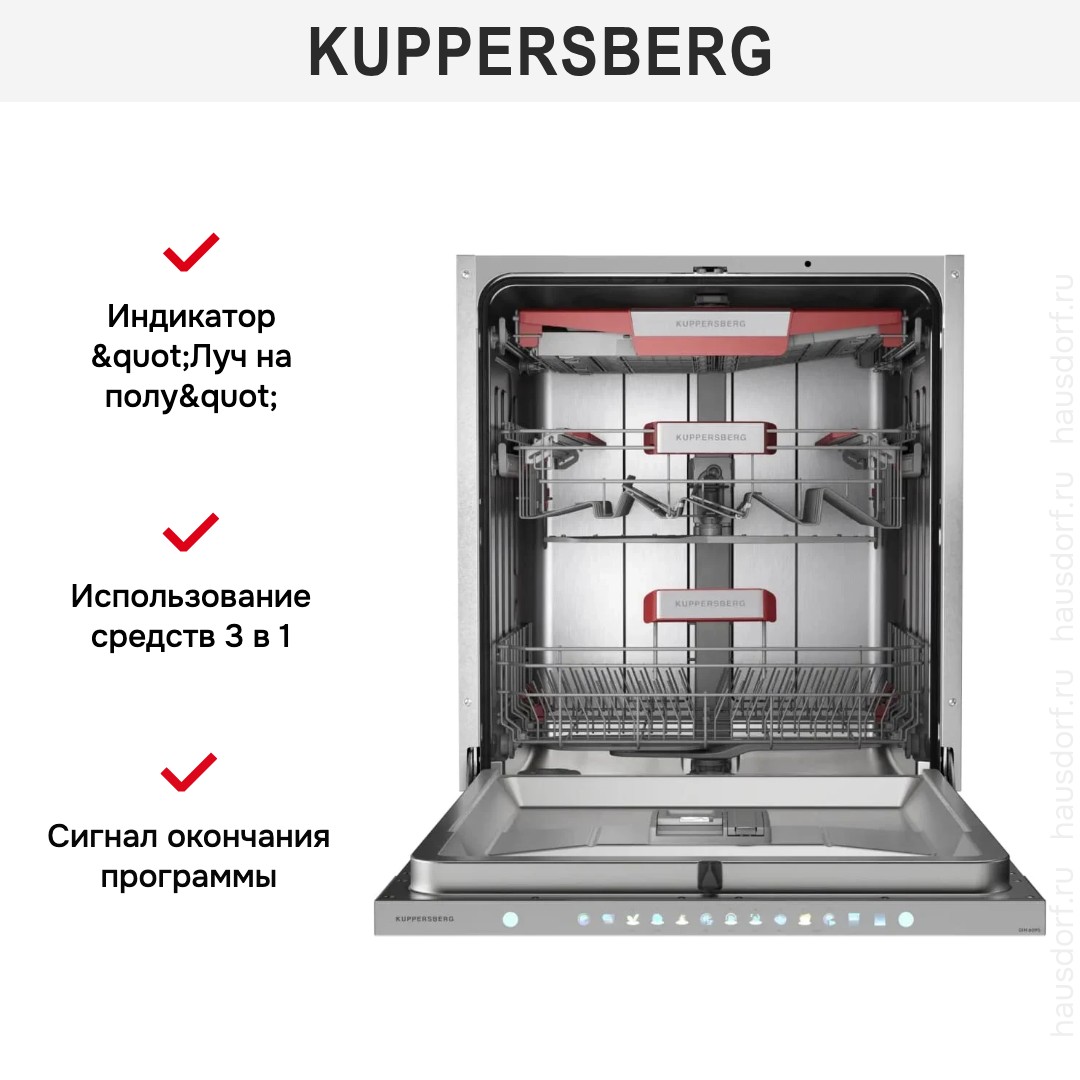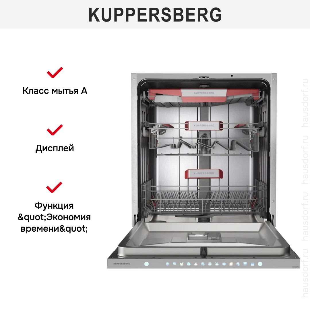 Встраиваемая посудомоечная машина Kuppersberg GIM 6095 представляет собой продуманное сочетание элегантного минимализма и инженерной эффективности, созданное для бесшовной интеграции во встроенную кухню. Компактный полноразмерный корпус с размерами 81.5×59.8×55 см вписывается в стандартную нишу 82×60×58 см и отличается аккуратной серебристой панелью управления, которую можно прикрыть фасадом по вашему стилю, сохраняя цельный интерьер. Внутренняя организация продумана до мелочей: три корзины и регулируемая по высоте верхняя полка позволяют разместить до 14 комплектов столовой посуды, удобная полочка для чашек в верхнем ящике и направляющие для тарелок в обеих корзинах обеспечивают надежную фиксацию при мойке. Дополнительный фиксатор для бокалов и секция для столовых приборов повышают универсальность размещения. Технологическая начинка ориентирована на экономию ресурсов и качество: инверторный мотор гарантирует тихую и надежную работу на уровне 44 дБ, водопотребление составляет всего 8 литров за цикл, а энергоэффективность подтверждена классом A+++ и расходом электроэнергии 0.654 кВт·ч на стандартный цикл Eco 50°C. Широкий набор программ — семь стандартных и шесть температурных режимов — включает гигиеничную функцию, автоматические режимы, интенсивную для сильных загрязнений, быструю мойку и деликатную обработку хрупких предметов, а также ночную программу и 58-минутный ускоренный цикл, что позволяет адаптировать работу под любой сценарий использования. Среди удобных опций — экономичная программа, самоочистка, режим эко и эксклюзивная функция «Экстра-сушка», автоматическое открытие дверцы по окончании цикла для улучшенного высыхания, а также система смягчения воды и возможность применения таблеток 3 в 1. Интеллектуальное электронное управление с LED-дисплеем и сенсорной панелью обеспечивает интуитивный выбор, предлагает таймер отсрочки запуска от 1 до 24 часов и информирует о состоянии прибора при помощи индикаторов соли, ополаскивателя, сигнала об окончании работы и полезного «луча на полу» для визуального контроля. Практичность дополнена съемными распылителями, дополнительным распылителем Plus Wash для повышенной эффективности и наличием фильтра, а также комплектом для монтажа, воронкой для засыпки соли, сливным и заливным шлангами. Безопасность на высоком уровне — полная защита от протечек и автоматическое отключение питания, регулируемые ножки и продуманная длина сетевого шнура 1.6 м делают установку гибкой. Продуманная конструкция дверцы с механизмом плавного открытия и закрытия, удобная закрытая панель и внутренняя подсветка упрощают загрузку и обслуживание. Этот прибор станет надежным помощником в повседневной кухонной рутине, сочетая стильный внешний вид с мощным функционалом и экономичным потреблением, предлагая пользователю высокий уровень комфорта и долговечность эксплуатации.