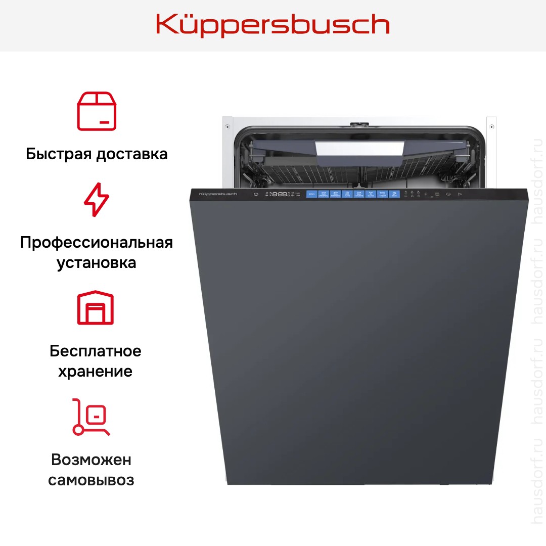 Встраиваемая модель Куперсбуш отлично впишется в любой интерьер, главное — правильно выбрать место, чтобы подвести коммуникации. Устанавливается в нишу целиком, полностью закрывается декоративной панелью. Обратите внимание: в комплекте не идет фасад, его необходимо установить самостоятельно. Имеет стандартные размеры, поэтому может не поместиться на очень маленькой кухне. В камеру можно загрузить ограниченное число комплектов: 14 шт. Комплектом считается набор посуды на одного человека, который нужен для полноценного приема пищи: глубокая и плоская тарелки, тарелка для салата, блюдце под чашку, сама чашка, ложка и вилка.