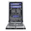 Узкая посудомойка с полным встраиванием устанавливается в обычную кухонную тумбу: крепежный набор поставляется вместе с устройством, а установку облегчают стандартные размеры — ширина 45 см, глубина 55 см и высота 81,5 см. спереди машина закрывается кухонным фасадом, к которому крепится ручка. Монтажный трафарет для точного крепления фасада также идет в комплекте.