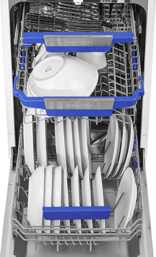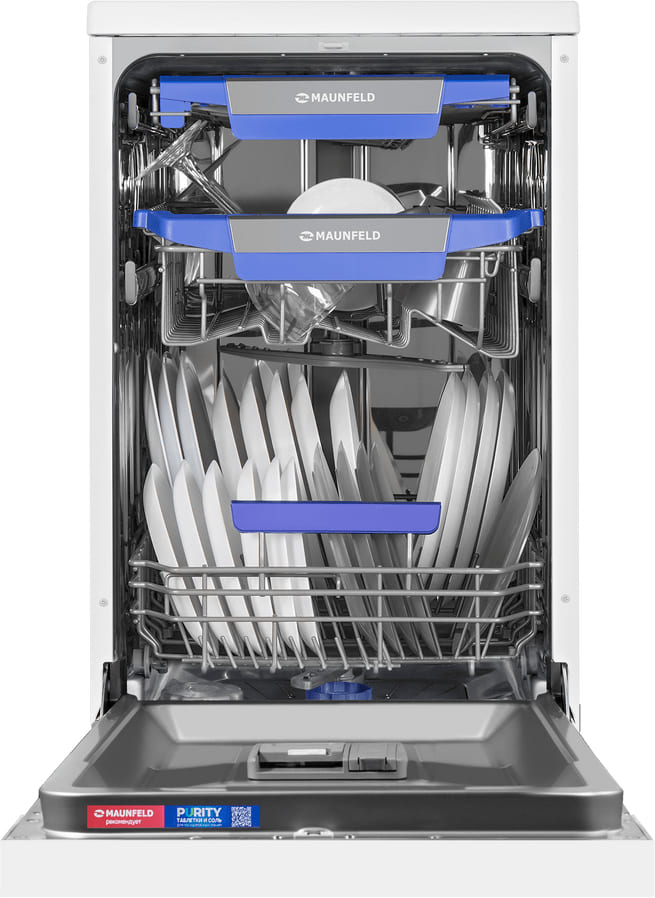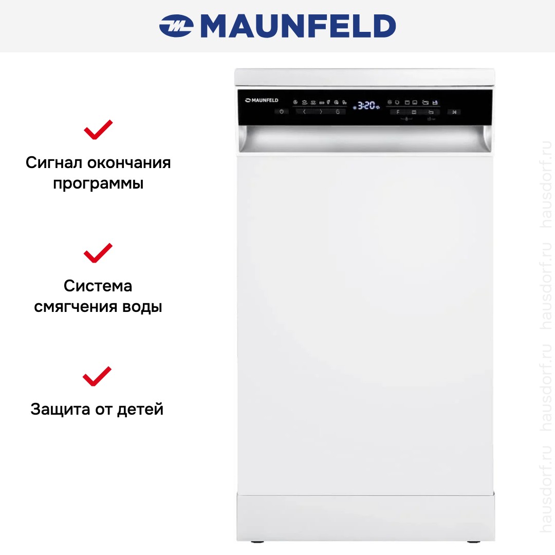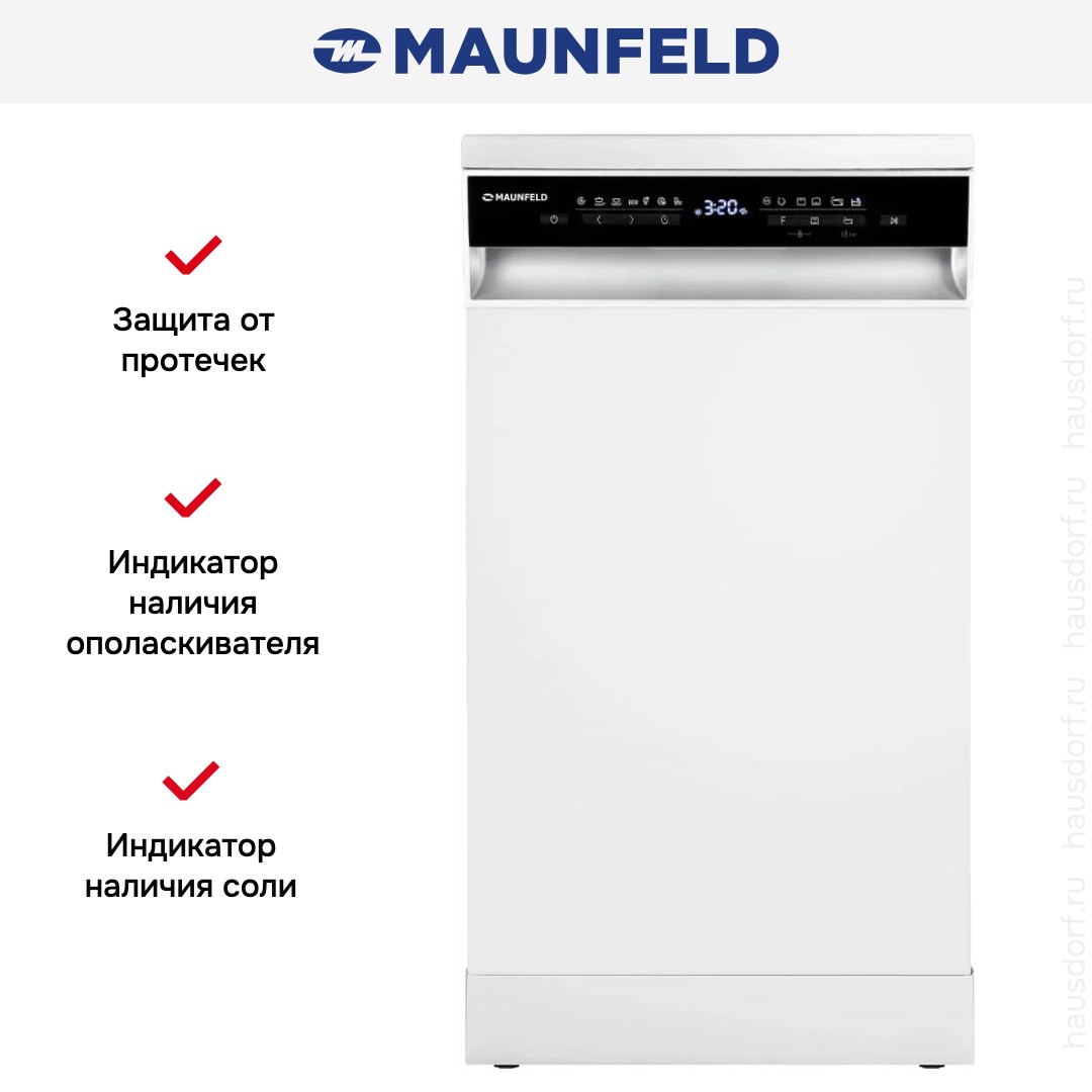 Посудомоечная машина Maunfeld MWF45331W-Inverter. Дизайн сочетает белый корпус с контрастной черной панелью управления, что делает прибор аккуратным и современным. Передняя панель открытая, с цифровым дисплеем и простыми кнопками включения и выбора программы. Узкие габариты в 44.8 см по ширине позволяют вписать устройство в компактную кухню без потери функциональности.