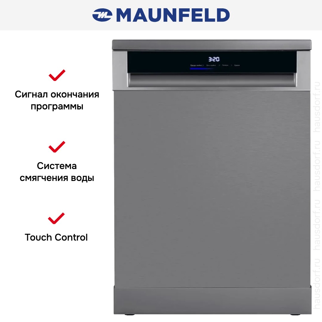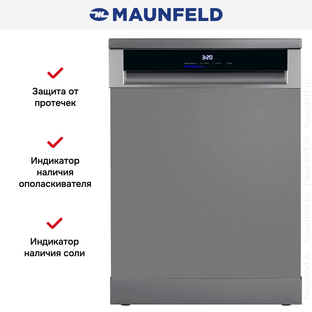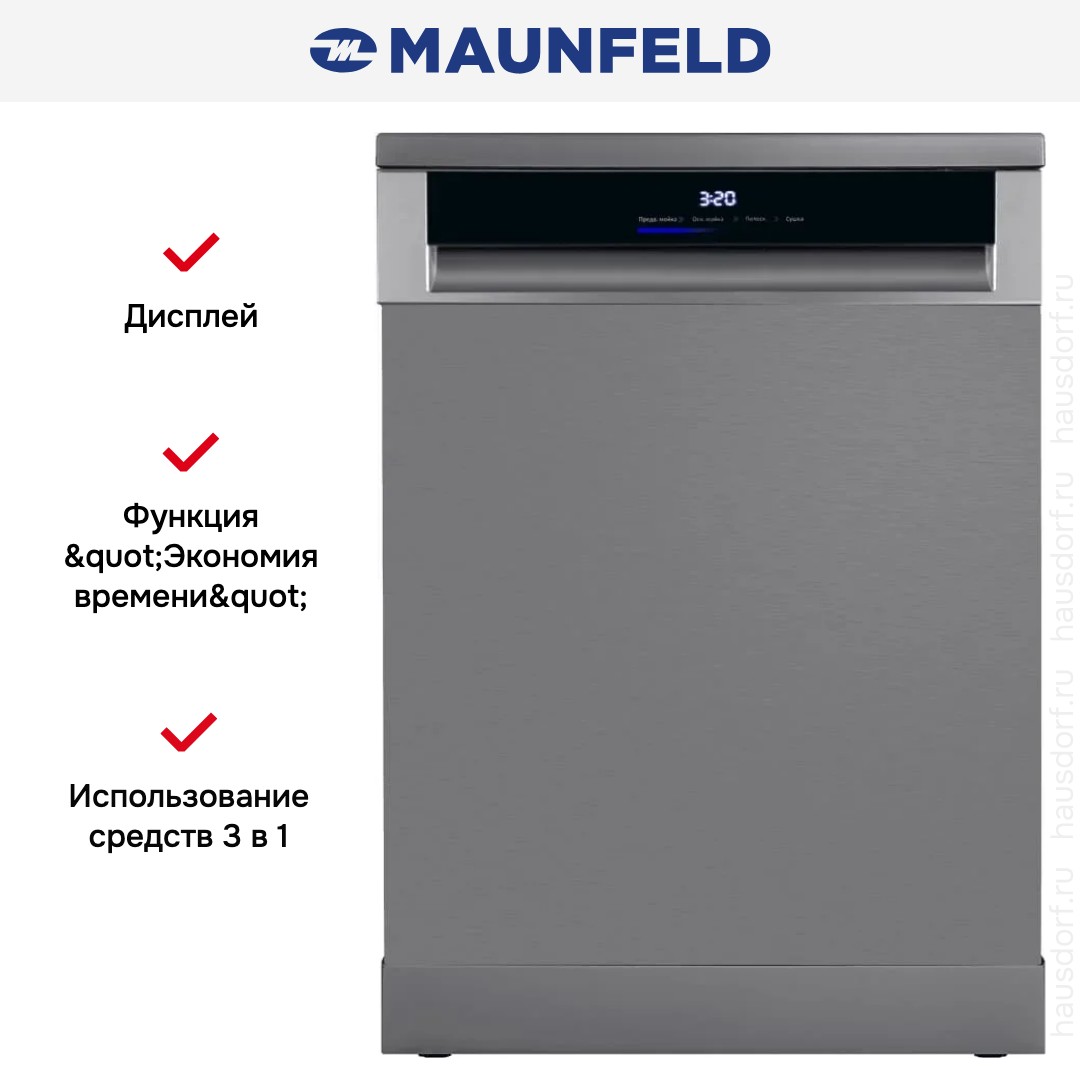 Посудомоечная машина Maunfeld MWF60331S Inverter — это продуманное сочетание сдержанного дизайна и практичных решений для современной кухни. Корпус из нержавеющей стали и черная открытая панель управления придают прибору премиальный вид, легко интегрируемый в интерьер как встраиваемой техники, так и отдельно стоящей установки — высота 84.5 см при стандартной ширине 59.8 см и глубине 60 см обеспечивает удобство размещения в кухонном пространстве, а с открытой дверцей глубина увеличивается до 117.5 см, что важно учитывать при планировке. Вместимость до 14 комплектов позволяет обслуживать большую семью или небольшой офис, а регулировка высоты верхней корзины и возможность мойки в любой из них обеспечивают гибкость при загрузке посуды различного размера: есть направляющие в нижнем отсеке и полочка для чашек в верхнем, а отдельная полка для столовых приборов делает хранение приборов аккуратным и безопасным. Устройство оснащено инверторным мотором, что снижает энергопотребление и уровень шума — всего 42 дБ — при этом обеспечивая стабильную работу и долговечность узлов. За сушку отвечает конденсационный режим класса A, который вместе с энергоэффективностью A+++ и экономичным расходом воды — 10 л за цикл — делает эксплуатацию выгодной и экологичной: годовой расход электроэнергии составляет 184 кВт·ч, годовой расход воды — 2744 л. Набор программ богат: 8 стандартных режимов покрывают все типичные сценарии — от деликатной и быстрой до интенсивной и ночной мойки; есть автоматические опции, гигиеническая программа и режим для слабозагрязненной посуды. Управление электронное с цифровым дисплеем и сенсорной панелью Touch Control позволяет точно выбирать параметры, таймер отсрочки старта на 1-24 часа дает возможность запускать цикл в удобное время, а индикация наличия ополаскивателя и соли, звуковой сигнал окончания и индикатор отсутствия подачи воды облегчают эксплуатацию. Среди дополнительных функций стоит выделить экономию времени, функцию самоочистки и совместимость со средствами 3 в 1. В комплекте идут заливной и сливной шланги длиной 1,4 м, предусмотрена система смягчения воды с регулировкой, фильтр, защита от протечек и сервисная диагностика, а автоматическое открытие дверцы по завершении цикла улучшает сушку и предотвращает образование запахов. Конструктивно прибор оснащен регулируемыми ножками, автоматическим отключением и рассчитан на стандартное напряжение 220-240 В при частоте 50 Гц, максимальная потребляемая мощность — 2100 Вт, максимальная температура нагрева — до 70 °C. Эта модель выигрышно выглядит на кухне благодаря лаконичным линиям и качественным материалам, при этом выделяется практичностью: удобные корзины, многофункциональная панель и экономичность в эксплуатации делают её оптимальным выбором для тех, кто ценит сочетание стиля, надежности и современных технологий.