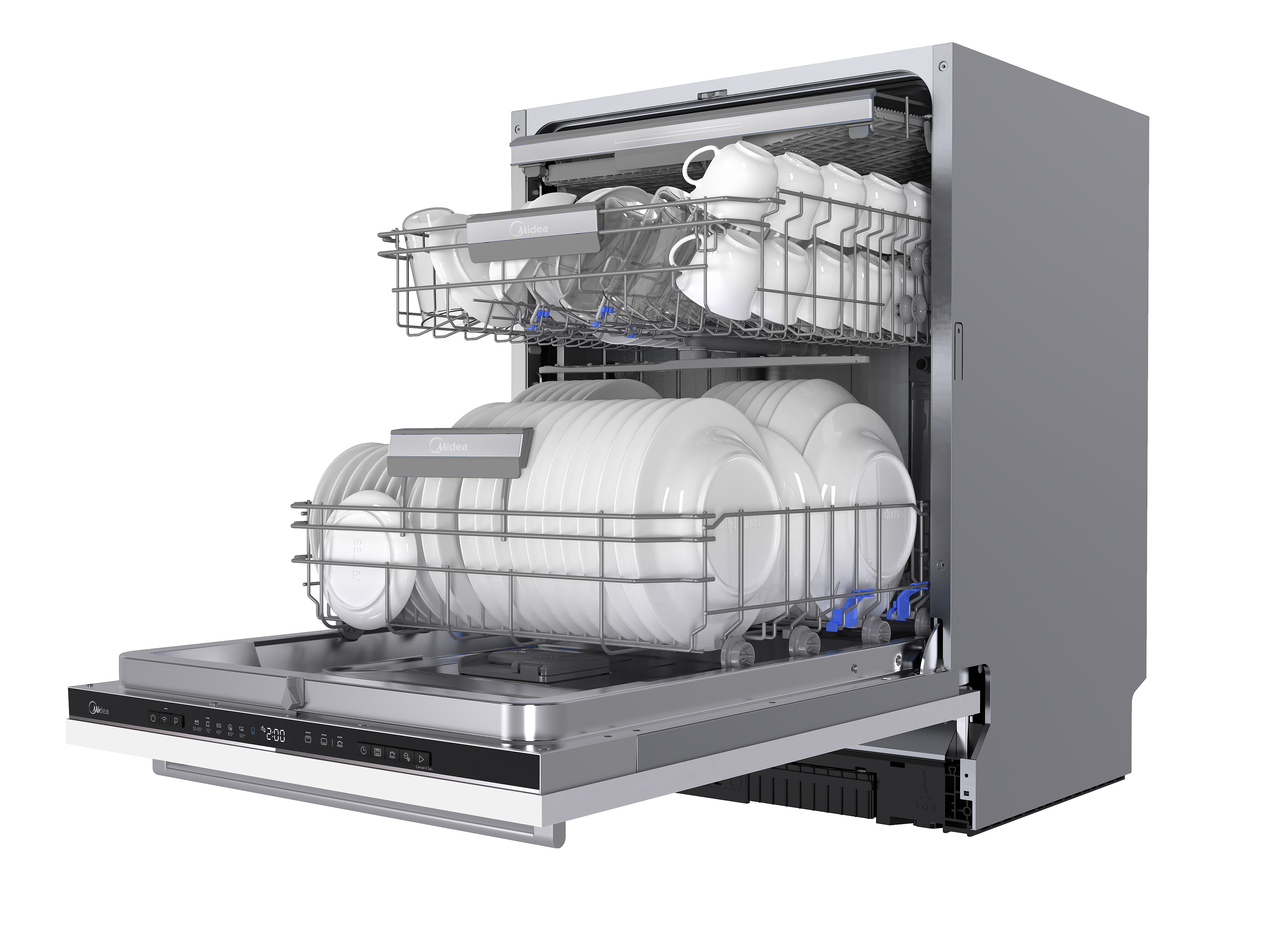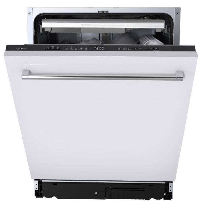 Встраиваемая модель Мидеа отлично впишется в любой интерьер, главное — правильно выбрать место, чтобы подвести коммуникации. Устанавливается в нишу целиком, полностью закрывается декоративной панелью. Обратите внимание: в комплекте не идет фасад, его необходимо установить самостоятельно. Имеет стандартные размеры, поэтому может не поместиться на очень маленькой кухне. В камеру можно загрузить ограниченное число комплектов: 14 шт. Комплектом считается набор посуды на одного человека, который нужен для полноценного приема пищи: глубокая и плоская тарелки, тарелка для салата, блюдце под чашку, сама чашка, ложка и вилка.