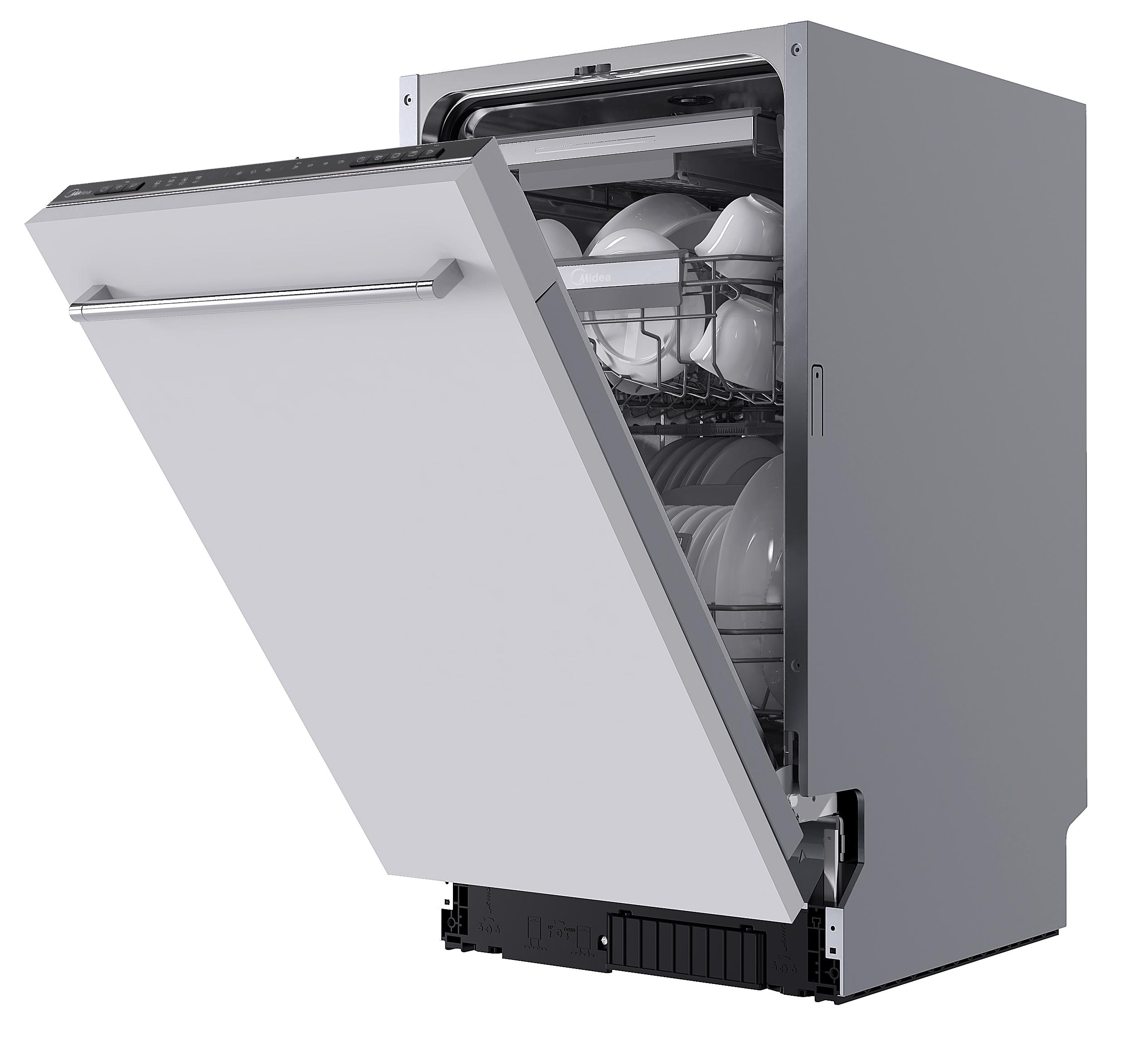 Встраиваемая модель Мидеа отлично впишется в любой интерьер, главное — правильно выбрать место, чтобы подвести коммуникации. Устанавливается в нишу целиком, полностью закрывается декоративной панелью. Обратите внимание: в комплекте не идет фасад, его необходимо установить самостоятельно. Имеет уменьшенную ширину — благодаря этому поместится даже на очень маленькой кухне. В камеру можно загрузить ограниченное число комплектов: 10 шт. Комплектом считается набор посуды на одного человека, который нужен для полноценного приема пищи: глубокая и плоская тарелки, тарелка для салата, блюдце под чашку, сама чашка, ложка и вилка.