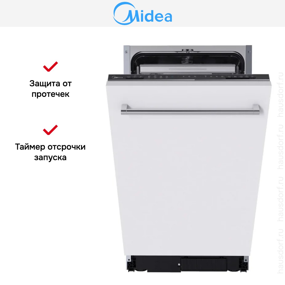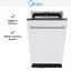 Посудомоечная машина Midea MID45S150I — полноинтегрируемая узкая модель, разработанная для аккуратной встройки под фасад кухни. Ее компактный корпус 81.5×44.8×55 см подходит для ниш высотой от 81.5 до 87.5 см и глубиной 55 см. Панель управления скрыта за фасадом, а видимая декоративная часть встраивается под ваш кухонный гарнитур. Черная панель управления аккуратно смотрится при открытой дверце и не привлекает лишнего внимания в закрытом состоянии.