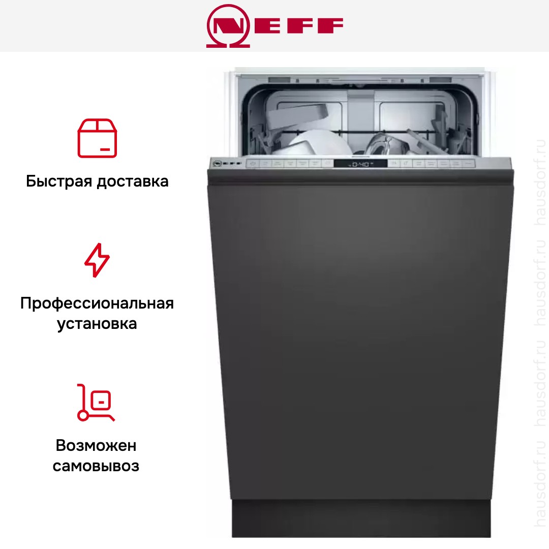 Встраиваемая модель Нефф отлично впишется в любой интерьер, главное — правильно выбрать место, чтобы подвести коммуникации. Устанавливается в нишу целиком, полностью закрывается декоративной панелью. Обратите внимание: в комплекте не идет фасад, его необходимо установить самостоятельно. Имеет уменьшенную ширину — благодаря этому поместится даже на очень маленькой кухне. В камеру можно загрузить ограниченное число комплектов: 9 шт. Комплектом считается набор посуды на одного человека, который нужен для полноценного приема пищи: глубокая и плоская тарелки, тарелка для салата, блюдце под чашку, сама чашка, ложка и вилка.