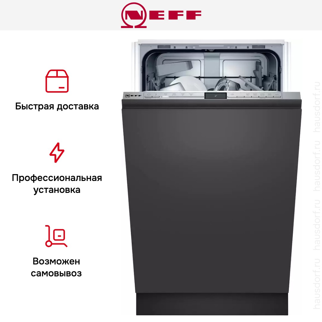 Встраиваемая модель Нефф отлично впишется в любой интерьер, главное — правильно выбрать место, чтобы подвести коммуникации. Устанавливается в нишу целиком, полностью закрывается декоративной панелью. Обратите внимание: в комплекте не идет фасад, его необходимо установить самостоятельно. Имеет уменьшенную ширину — благодаря этому поместится даже на очень маленькой кухне. В камеру можно загрузить ограниченное число комплектов: 9 шт. Комплектом считается набор посуды на одного человека, который нужен для полноценного приема пищи: глубокая и плоская тарелки, тарелка для салата, блюдце под чашку, сама чашка, ложка и вилка.