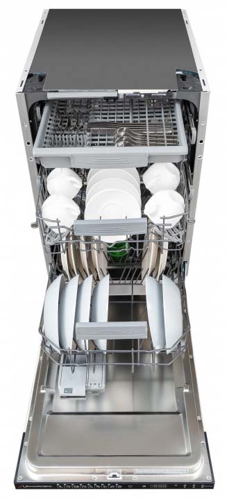 Встраиваемая модель Шауб Лоренц отлично впишется в любой интерьер, главное — правильно выбрать место, чтобы подвести коммуникации. Устанавливается в нишу целиком, полностью закрывается декоративной панелью. Обратите внимание: в комплекте не идет фасад, его необходимо установить самостоятельно. Имеет уменьшенную ширину — благодаря этому поместится даже на очень маленькой кухне. В камеру можно загрузить ограниченное число комплектов: 10 шт. Комплектом считается набор посуды на одного человека, который нужен для полноценного приема пищи: глубокая и плоская тарелки, тарелка для салата, блюдце под чашку, сама чашка, ложка и вилка.