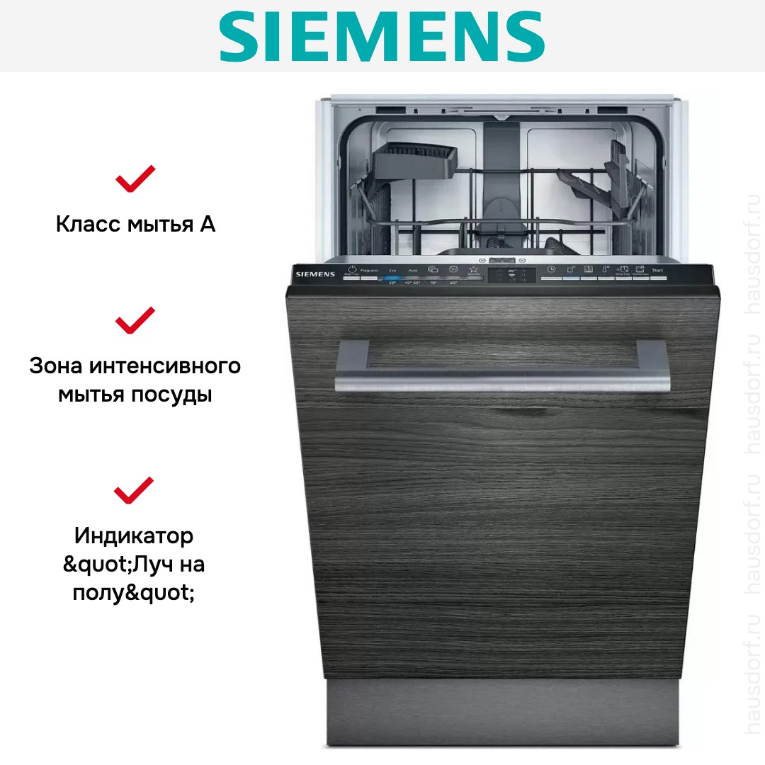 Встраиваемая модель Сименс отлично впишется в любой интерьер, главное — правильно выбрать место, чтобы подвести коммуникации. Устанавливается в нишу целиком, полностью закрывается декоративной панелью. Обратите внимание: в комплекте не идет фасад, его необходимо установить самостоятельно. Имеет уменьшенную ширину — благодаря этому поместится даже на очень маленькой кухне. В камеру можно загрузить ограниченное число комплектов: 9 шт. Комплектом считается набор посуды на одного человека, который нужен для полноценного приема пищи: глубокая и плоская тарелки, тарелка для салата, блюдце под чашку, сама чашка, ложка и вилка.