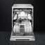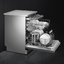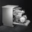 Серебристая посудомоечная машина с дверцей из нержавеющей стали от Smeg. Электронное управление и интуитивно понятный дисплей позволяют активировать таймер отсрочки включения, проконтролировать продолжительность программы или время до окончания мытья.