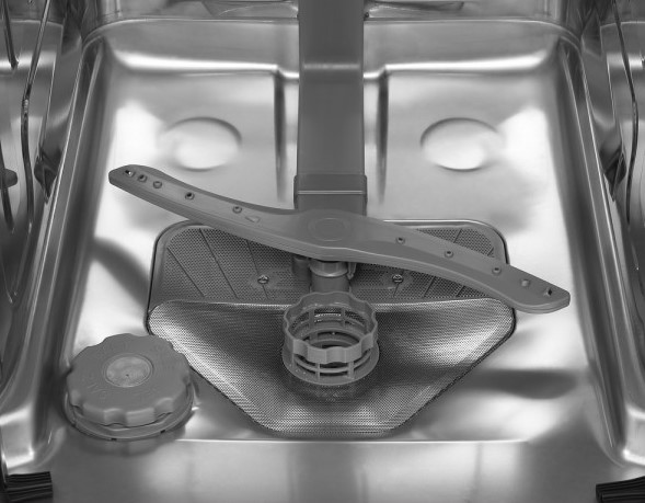 Сливной фильтр располагается на дне камеры и предотвращает попадание в канализацию остатков пищи и засорение сливного шланга и насоса. Материал изготовления и конструкция фильтра зависит от модели посудомойки. В устройствах премиум-класса сливной фильтр изготавливается из стали и имеет вид цилиндра из частой сетки, задерживающей даже мелкий мусор. В более дешевых моделях эта деталь может изготавливаться из пластика. Рекомендуется извлекать и промывать этот фильтр не реже раза в месяц при постоянном использовании посудомойки, а посуду перед помещением в корзину очищать от крупных остатков пищи.