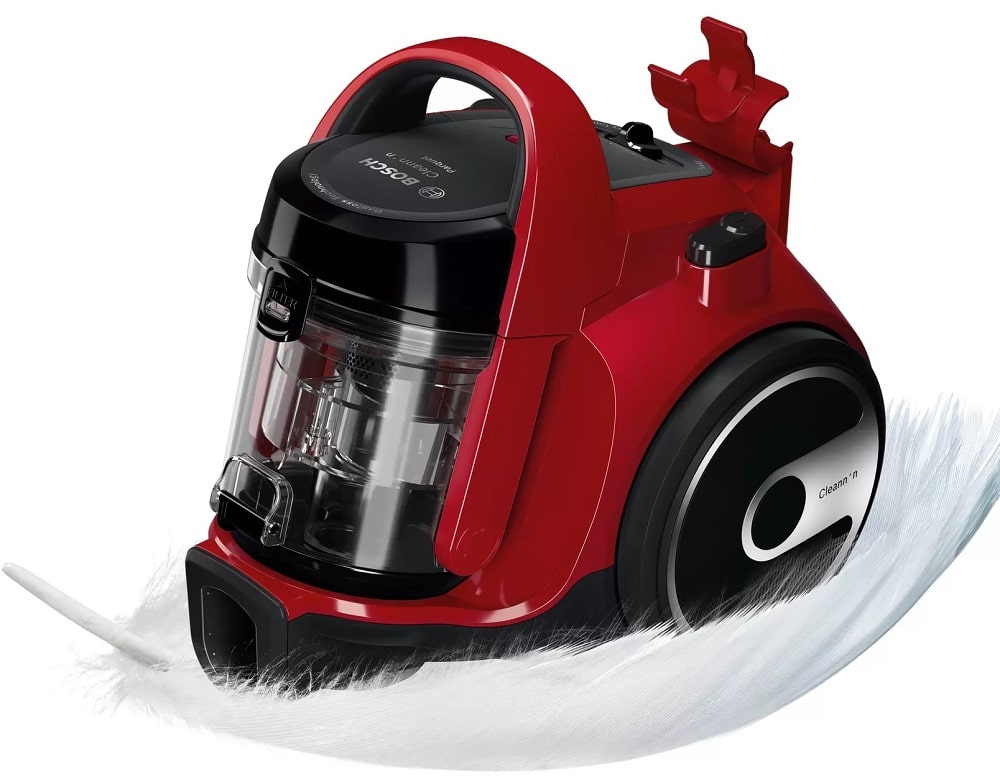 Пылесос Bosch BGC05AAA2 имеет стандартную конфигурацию — корпус на колесах, крепящийся к нему шланг с трубками-удлинителями и насадками. Данная модель рассчитана только на сухую уборку, которой достаточно для большинства пользователей. Мощный поток воздуха позволяет быстро всасывать как мелкие, так и крупные частицы, волосы и шерсть. Основной цвет прибора — красный. В качестве пылесборника производитель установил стандартный контейнер. Пользоваться им легко и удобно: чтобы очистить, просто достаньте его и высыпьте все в мусорное ведро, а затем протрите или вымойте емкость изнутри. Объем заполнения пылесборника — 1.5 л.
