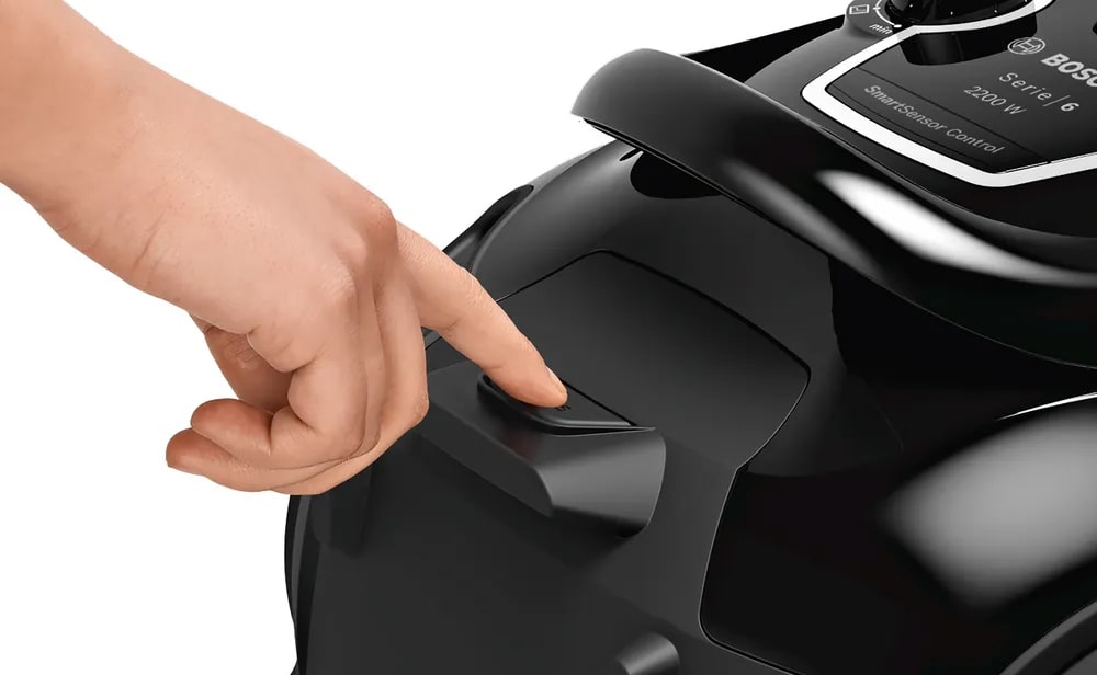 Управление мощностью на корпусе пылесоса производится при помощи поворотного переключателя или кнопок с обозначениями «+» и «-». Расположение управляющих элементов на корпусе — особенность напольных пылесосов: кнопки на них достаточно велики, чтобы нажимать их можно было не только рукой, но и ногой.