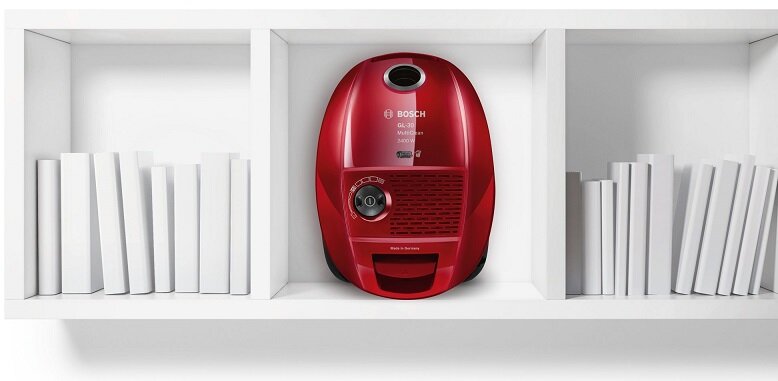 Пылесос Bosch BSGL3MULT3 имеет стандартную конфигурацию — корпус на колесах, крепящийся к нему шланг с трубками-удлинителями и насадками. Данная модель рассчитана только на сухую уборку, которой достаточно для большинства пользователей. Мощный поток воздуха позволяет быстро всасывать как мелкие, так и крупные частицы, волосы и шерсть. Основной цвет прибора — красный. Пылесборник-мешок — привычный вариант, с которым легко работать, можно не беспокоиться о чрезмерном расходе электроэнергии. Он тщательно запирает внутри крупную пыль, но может незначительно пропускает очень мелкие частицы. Объем заполнения пылесборника — 4 л.