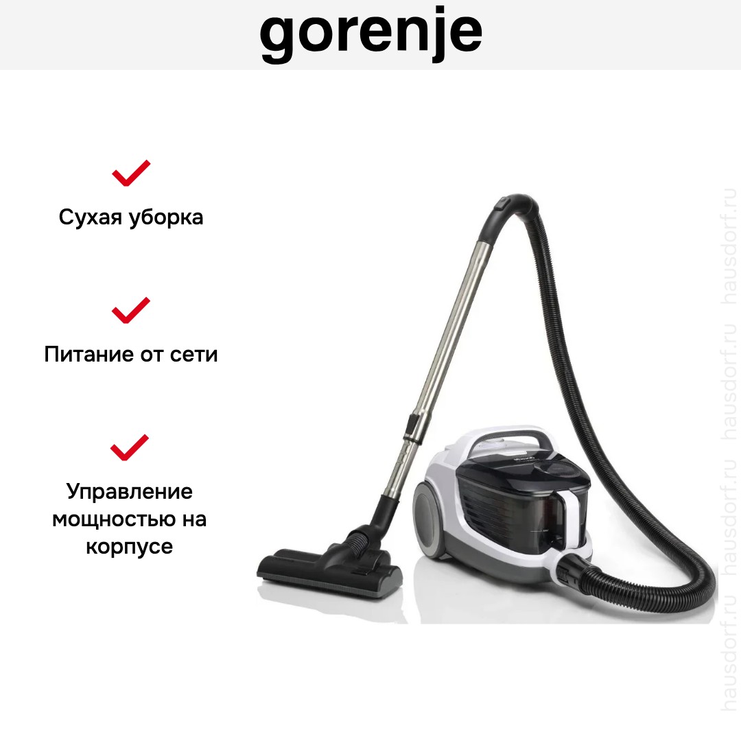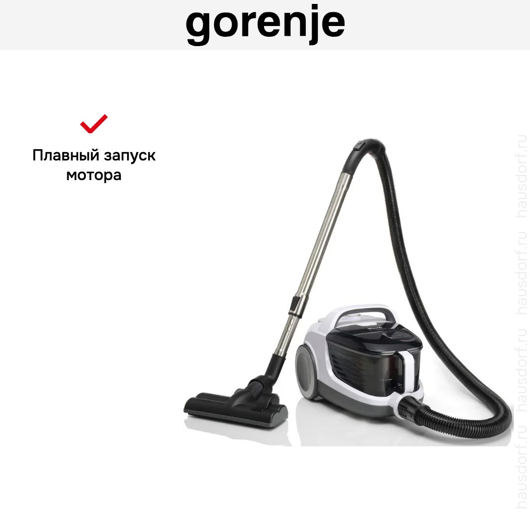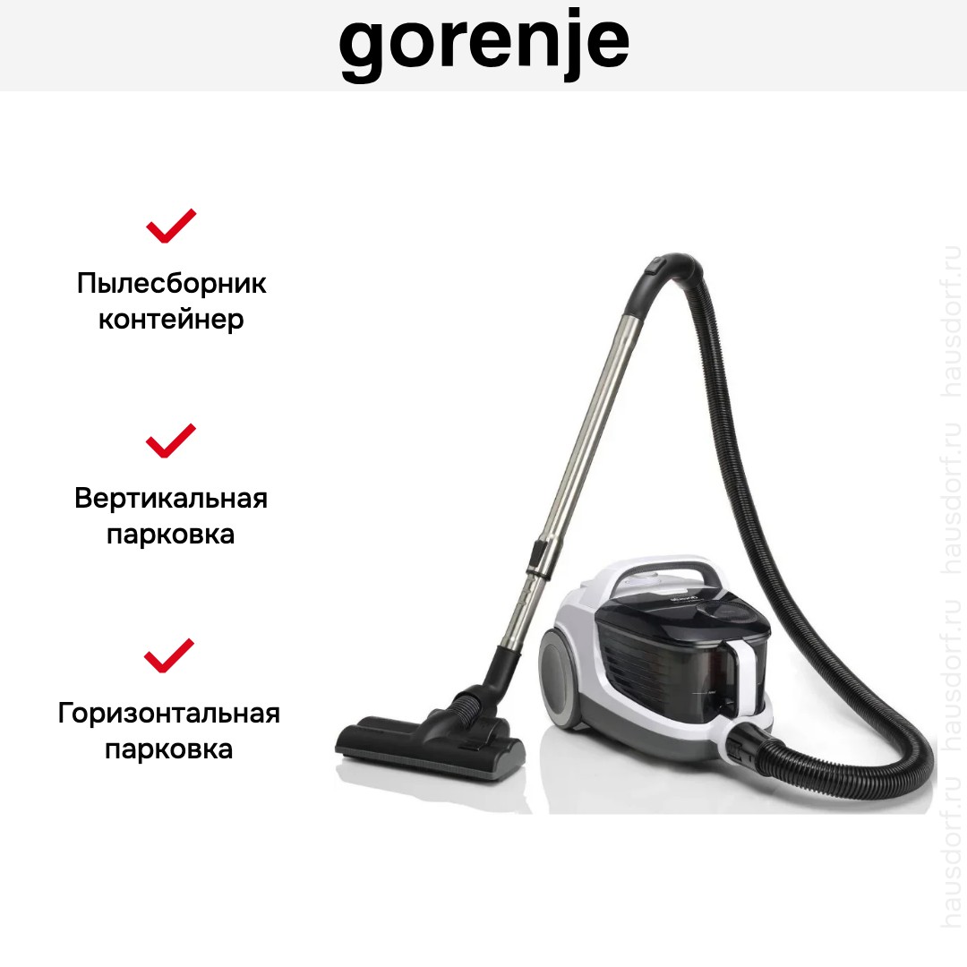 Пылесос Gorenje VC2101GALWCY имеет стандартную конфигурацию — корпус на колесах, крепящийся к нему шланг с трубками-удлинителями и насадками. Данная модель рассчитана только на сухую уборку, которой достаточно для большинства пользователей. Мощный поток воздуха позволяет быстро всасывать как мелкие, так и крупные частицы, волосы и шерсть. Основной цвет прибора — белый. В качестве пылесборника производитель установил стандартный контейнер. Пользоваться им легко и удобно: чтобы очистить, просто достаньте его и высыпьте все в мусорное ведро, а затем протрите или вымойте емкость изнутри. Объем заполнения пылесборника — 3.3 л.