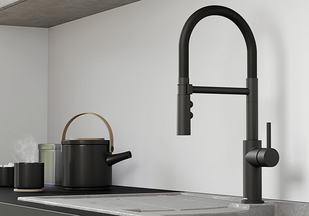 Внутри крана помещается шланг, который можно растянуть, чтобы достать струей воды до второй чаши мойки или тщательно сполоснуть посуду.