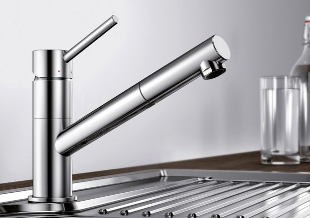 Внутри крана помещается шланг, который можно растянуть, чтобы достать струей воды до второй чаши мойки или тщательно сполоснуть посуду.