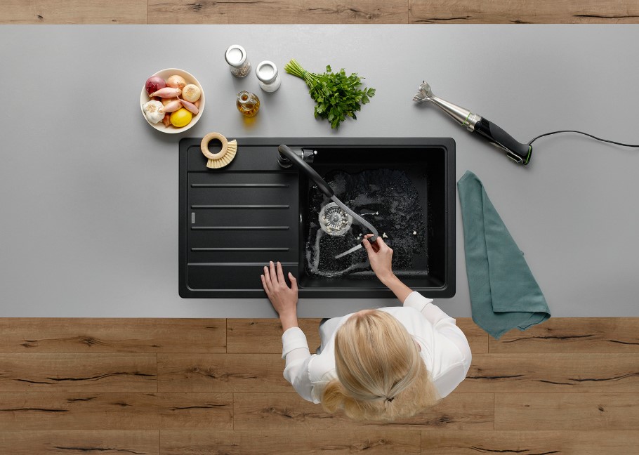 Внутри крана помещается шланг, который можно растянуть, чтобы достать струей воды до второй чаши мойки или тщательно сполоснуть посуду.