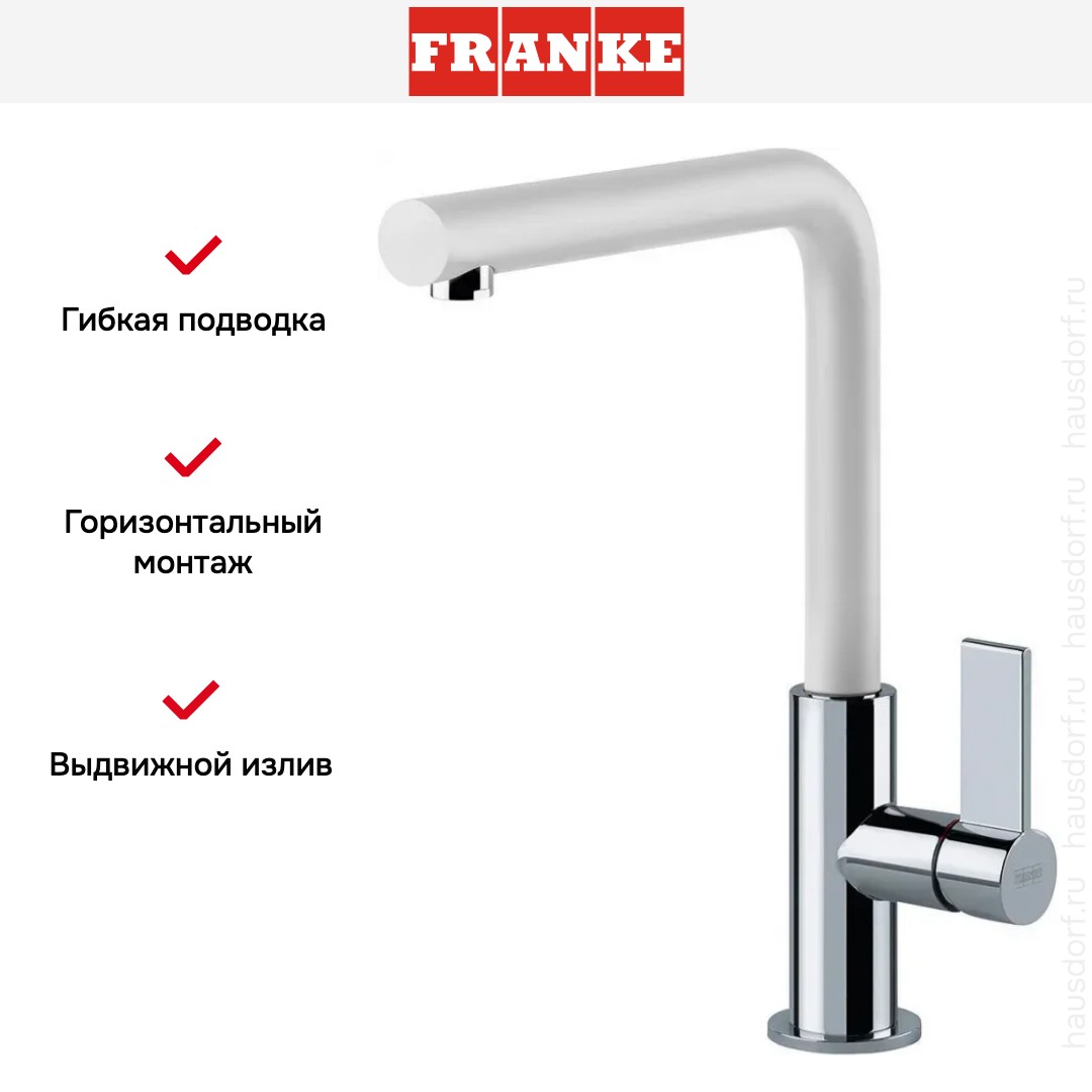 Смеситель Franke Neptune Evo Nozzle, белый. Эта однорычажная модель сочетает чистую форму и продуманную эргономику, она станет заметным элементом современной кухни.