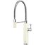 Выдвижной излив в кухонном смесителе — это гибкая трубка из резины в металлической оплетке, расположенная внутри основного излива. Для того, чтобы воспользоваться гибким изливом — например, наполнить высокую посуду, — достаточно включить воду и потянуть за головку, находящуюся на конце трубки.