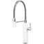 Выдвижной излив в кухонном смесителе — это гибкая трубка из резины в металлической оплетке, расположенная внутри основного излива. Для того, чтобы воспользоваться гибким изливом — например, наполнить высокую посуду, — достаточно включить воду и потянуть за головку, находящуюся на конце трубки.