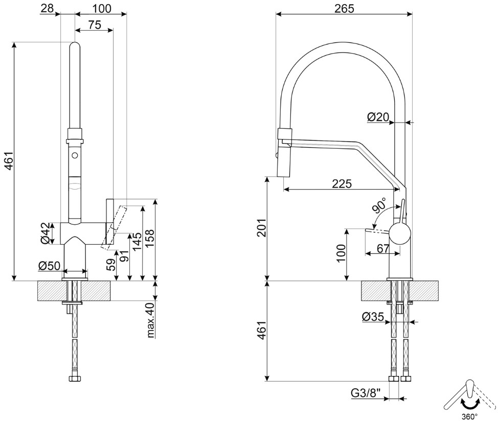 Горизонтальная установка привычна нам: смеситель устанавливается на краю мойки или столешницы. При вертикальной кран крепится на стену.