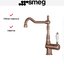 Однорычажный смеситель с поворотным изливом от Smeg в медном цвете. Предусмотрена функция ESC — Easy Saving Cartridge — снижающая расход горячей воды. Рычаг смесителя, установленный в центральное положение, поставляет только холодную воду, а не 50% + 50% от горячего и холодного. Для получения горячей воды необходимо повернуть рычаг дальше влево.