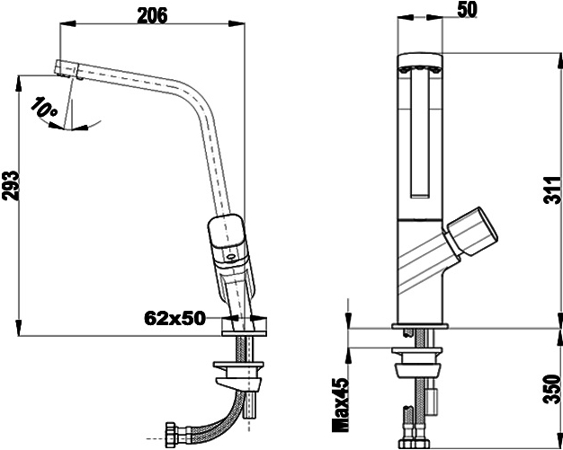 Горизонтальная установка привычна нам: смеситель устанавливается на краю мойки или столешницы. При вертикальной кран крепится на стену.